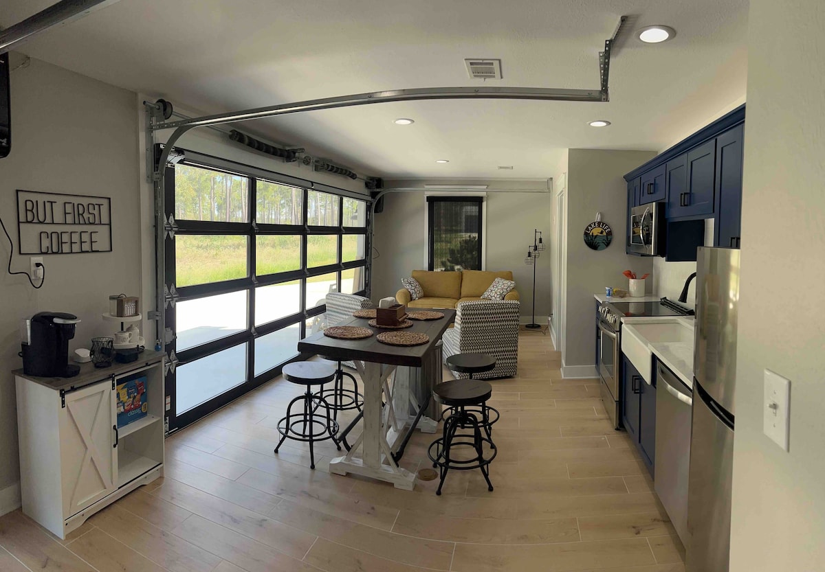 Notre suite d'invités est magnifiquement conçue et comprend deux chambres à coucher, l'une avec un grand lit, l'autre avec deux lits simples, un grand canapé-lit dans l'un des salons, une salle de bain attenante, une cuisinette entièrement équipée, une table à manger et deux espaces extérieurs pour s'asseoir, l'un avec un foyer, l'autre avec un barbecue, ainsi qu'un patio couvert avec une télévision. Notre suite d'invités fait partie de notre maison au bord du lac au milieu de belles conifères. LA MAISON PRINCIPALE ne sera pas utilisée pendant que vous êtes notre invité.