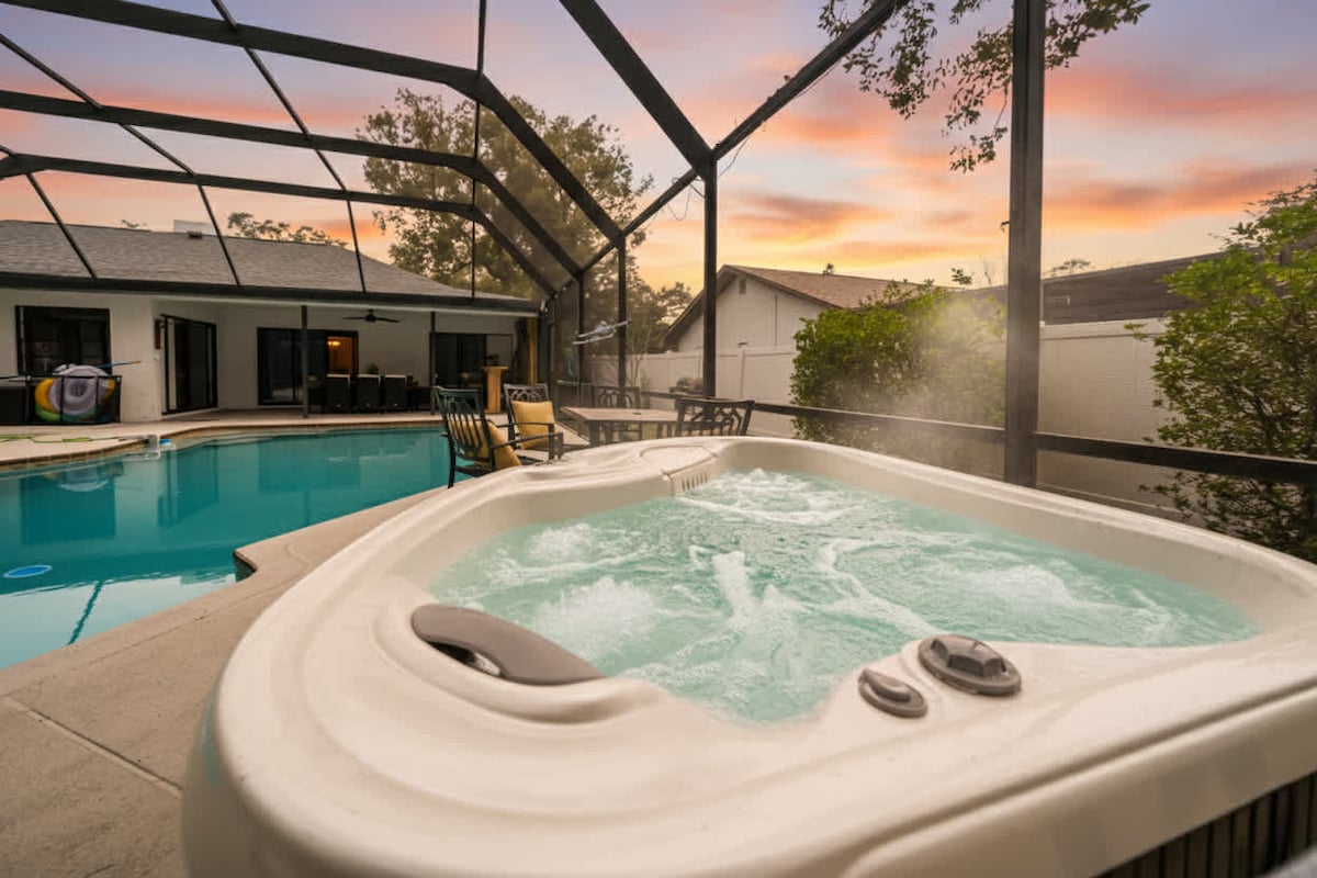 Logement Airbnb parmi les 1 % les mieux notés — Très bien noté et fiable Profitez de votre escapade dans notre logement élégant doté d'une GRANDE PISCINE CHAUFFÉE GRATUITE, de sièges au bord de la piscine, d'espaces pour manger et bronzer, et d'un éclairage à DEL. Détendez-vous grâce aux barbecues, au hamac, au foyer, aux jeux extérieurs et à la cour arrière entièrement clôturée – IDÉAL POUR LES FAMILLES ET LES ANIMAUX! Impasse tranquille, à seulement 5 minutes des plages. La magnifique maison offre 3 chambres spacieuses, 2 salles de bains haut de gamme, une cuisine entièrement équipée, un espace de travail désigné et une télévision 85 pouces dans le salon !