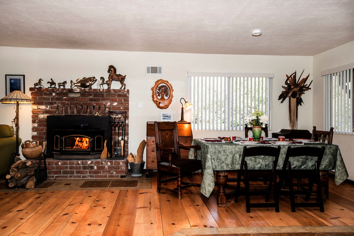 RÉDUCTION DE NOËL EN RAISON D'UNE ANNULATION ! Famille/Groupe/Retraite/Réunion/Escapade, à seulement 6 miles pavés de l'I-5 avec terrain plat pour s'amuser facilement. Les séquoias vous accueillent dans 3500 pieds carrés pour 25 personnes et plus. Rarement accessible aux personnes handicapées ! Animaux acceptés. Parking illimité. Confortable 4 lits/4 salles de bain/plan d'étage ouvert. Salle de loisirs/lits superposés avec ping-pong. Quartier calme entouré de forêt nationale. Sentiers de randonnée. Neige en saison. Vue sur la montagne. Étoiles. Barbecue. Starlink. À distance de marche de la pizza/des magasins.