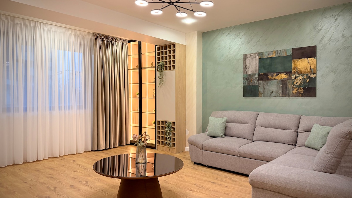 Profitez de votre séjour à Bucarest au calme dans un appartement luxueux et confortable avec une vue exceptionnelle, non loin de nombreux restaurants et lieux de divertissement. 10min de l'aéroport, 3min de Baneasa Shopping city, 10min du parc Herastrau, 12min des Thermes. L'appartement est équipé de meubles luxueux, d'un lit d'hôtel 5 étoiles et d'une salle de bain en porcelanosa. Terrasse de 75m2 avec une vue incroyable sur le lever et le coucher du soleil, dernier 8ème étage sans voisins.