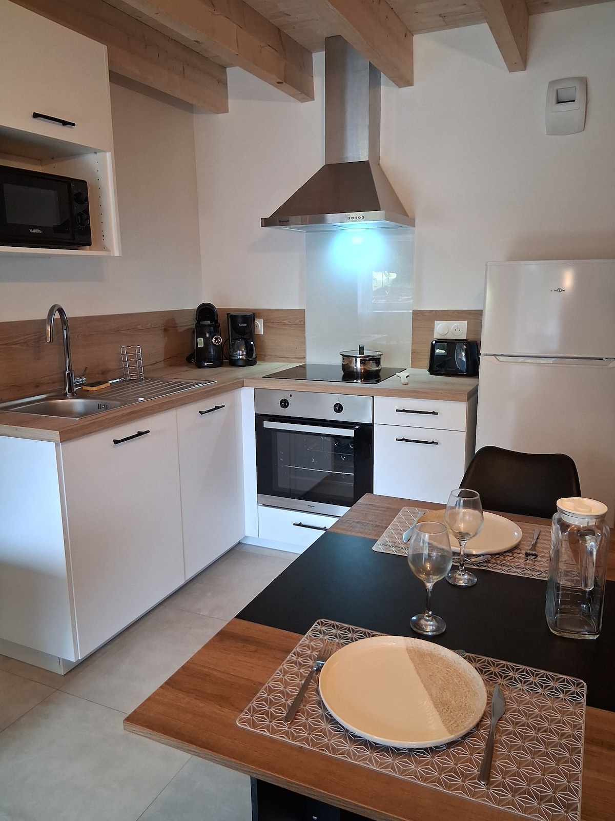 The apartment is 80m2 with private parking The apartment has : - A fully equipped kitchen with a fridge, oven, induction hob, dishwasher, and washing machine. - A bathroom with a shower and sink, plus a separate toilet connected to the bathroom by a sliding door. - A bedroom with a 160cm bed and an open wardrobe. - A room with a desk and a bunk bed. - A living-dining room with a sofa, à day bed (that turns in 160cm bed), an extending table and smart TV. - A balcony with a table and chairs.