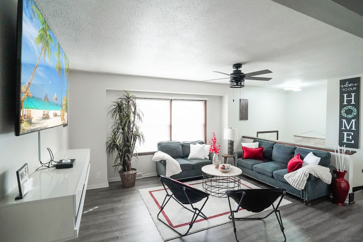 Maison de style familial dans un quartier calme, sûr et beau à Platte City offre un espace propre pour s'étirer ou accueillir de plus grands groupes de voyageurs. À seulement 5 minutes de l'aéroport international de Kansas City (MCI) et à 20 minutes au nord du centre-ville de Kansas City, vous profiterez de l'air frais et des espaces de vie confortables! Notre logement coloré est entièrement équipé pour des séjours courts ou longs. Les hôtes vivent dans les environs immédiats pour vous aider avec tout ce dont votre séjour peut avoir besoin.