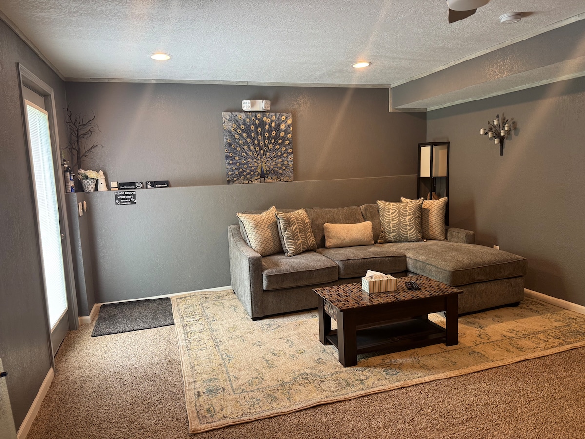 L'annonce concerne tout le sous-sol. Le type d'annonce indique que c'est une maison entière, mais l'annonce ne concerne que le sous-sol entier. En raison de la limitation de la description des annonces Airbnb, j'ai sélectionné la meilleure option qui décrit le logement. Sous-sol avec une chambre spacieuse avec salle de bain attenante, kitchenette et salon. Le logement est de plain-pied sans marches à l'intérieur. À 11 min/8,6 mi de l'aéroport, 25 min/22 mi d'Arrowhead, 20 min/15,3 mi du centre-ville de KC, 27 min/21,5 min de KCZoo