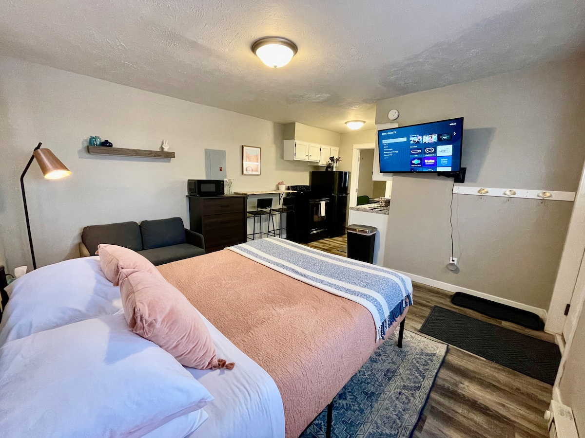 Notre suite studio de luxe est située dans un cul-de-sac calme et haut de gamme, à 5 minutes de l'aéroport et à 10 minutes du centre-ville. Les équipements comprennent une entrée et une terrasse privées, une entrée sans clé, une salle de bain 3/4 attenante, une buanderie, une salle d'exercice avec rameur et sauna infrarouge pour 4 personnes, des sols carrelés chauffés, des commandes de chauffage et de climatisation dédiées, de l'eau douce, un micro-ondes, une cafetière, un mini-réfrigérateur/congélateur, une connexion Wi-Fi haut débit de 1 Go/s, une télévision connectée de 50", Apple TV, Netflix, Hulu, Disney+, un PC Windows 10, un moniteur de 27", une imprimante, un fer et une planche à repasser, ainsi qu'un sèche-cheveux.