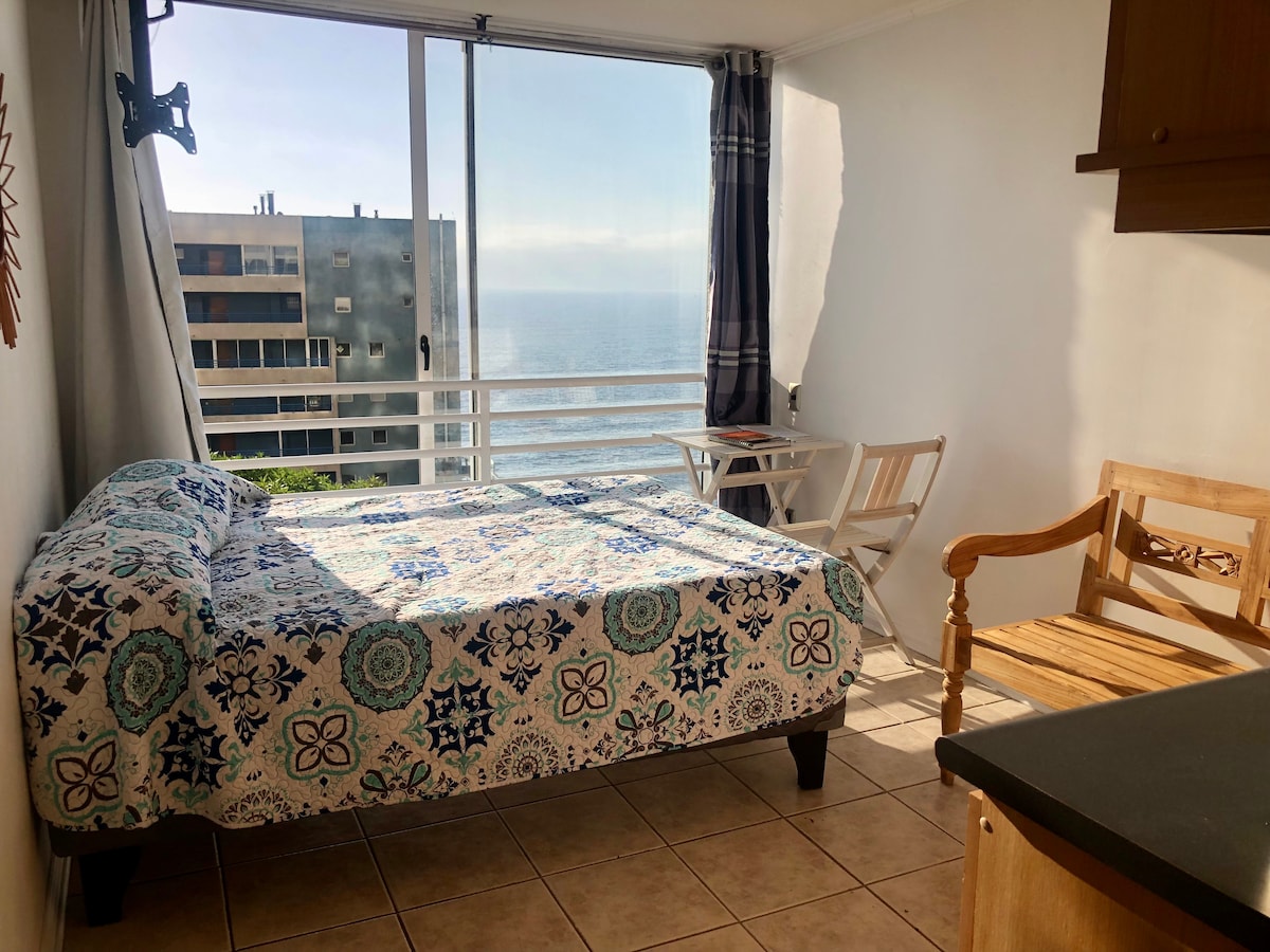 Joli studio avec vue sur la mer, entièrement équipé pour deux personnes. La copropriété dispose d'une piscine aménagée au 7e étage, d'un service de conciergerie 24h/24, d'une cafétéria et d'un parking couvert privé. Accès à la plage de Cochoa par le funiculaire de l'immeuble (1er étage) ou par les escaliers (à 300 m). L'appartement dispose du WIFI, d'une smart TV, d'un sèche-cheveux, de serviettes, de draps, d'un chauffage, d'un placard. Bonne connectivité et proche des restaurants, cafés, supermarchés, dunes de Concón et plage de Reñaca
