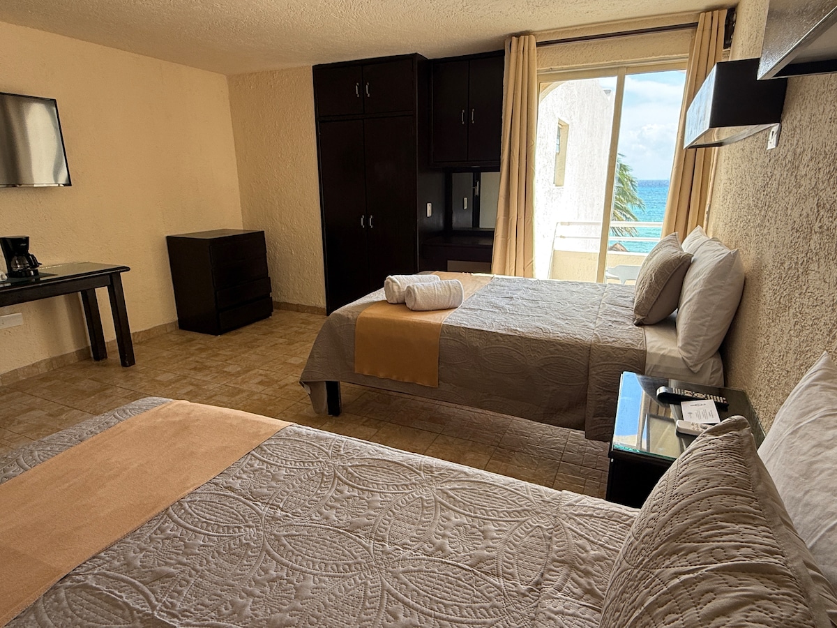 À l'intérieur du Riviera Maya Suites Condo-Hotel, détendez-vous dans une chambre spacieuse et confortable avec un balcon pour deux personnes et une entrée séparée. Elle dispose d'un lit king-size, d'une salle de bain privée avec des commodités, d'un service de ménage quotidien inclus, d'une connexion Wi-Fi, d'une piscine commune avec jacuzzi, d'un coffre-fort, d'un minibar, de la télévision par câble, d'un stationnement gratuit et de caméras de sécurité et de surveillance 24 h/24. Profitez des hamacs et des chaises longues sur le toit commun avec une belle vue partielle sur l'océan. Réception bilingue.