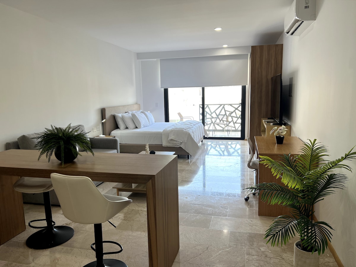 Vous ferez l'expérience de confort et de tranquillité dans notre SUITE ALUNA SPACIEUSE et accueillante. Vous profiterez d'une cuisine équipée, d'un lit King Size, d'une Smart TV, d'une connexion Wi-Fi à 500 Mbps et d'une terrasse avec jacuzzi privé donnant sur la nature. Reposez-vous dans cet environnement serein, à l'intérieur du complexe MAISON JUNGLE, situé dans un hameau privé sur la rue 38, à seulement 2 pâtés de maisons de la 5ème avenue, de la plage, des restaurants et des supermarchés.
