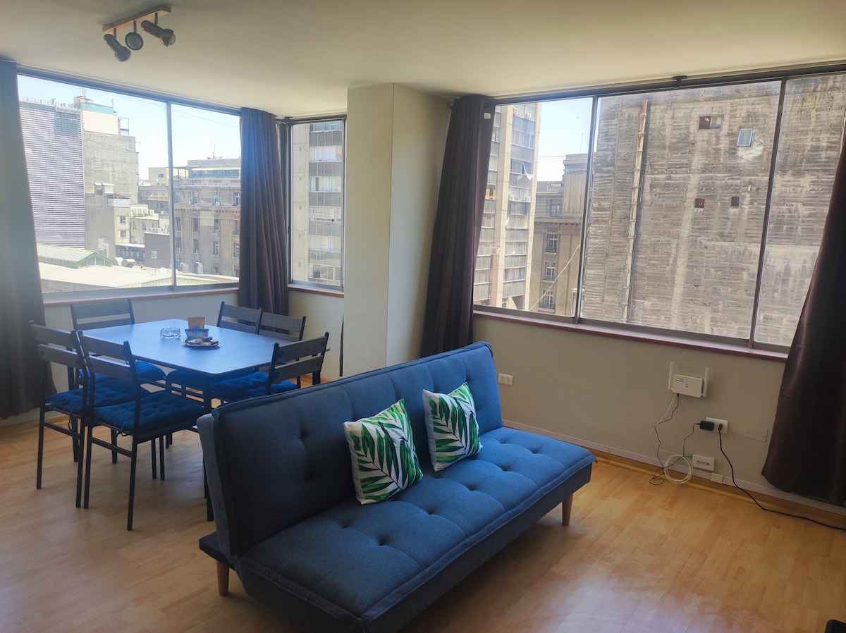 Disfruta este céntrico depto de 1 dormitorio + sofá cama ¡a un paso de todo!: calles principales, transporte (buses y metro), lugares turísticos, barrios bohemios (Lastarria, Barrio Italia), hospitales, plazas y parques. Ideal para estadías sin preocupaciones: tendrás todo lo necesario para que te sientas como en casa. Su vista al sur la hace fresca en verano aun sin aire acondicionado y ¡sin ruido exterior! las ventanas termopanel permiten descansar plácidamente. ¡Incluye un desayuno básico!