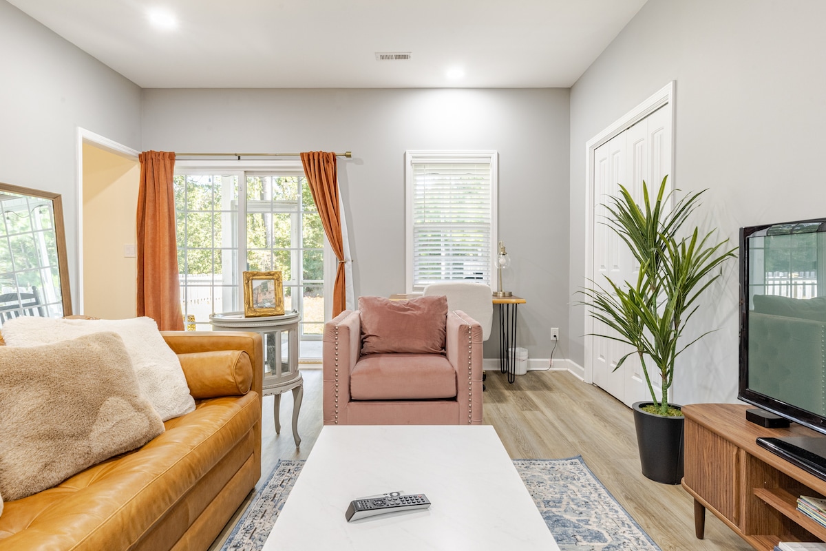 Cette suite se compose d'une chambre (lit King) et d'une salle de bain complète. L'entrée privée est située sur le porche avant et l'espace est fermé du reste de la maison. L'espace ne comprend pas de salon ni de cuisine, mais il y a un petit réfrigérateur, un micro-ondes, une cafetière, un coin salon confortable et un grand porche pour se détendre. Il y a également un purificateur d'air dans la pièce, avec filtration HEPA, éliminant 99,9 % de toutes les particules dans l'air. L'espace est de la taille d'une chambre d'hôtel moyenne.