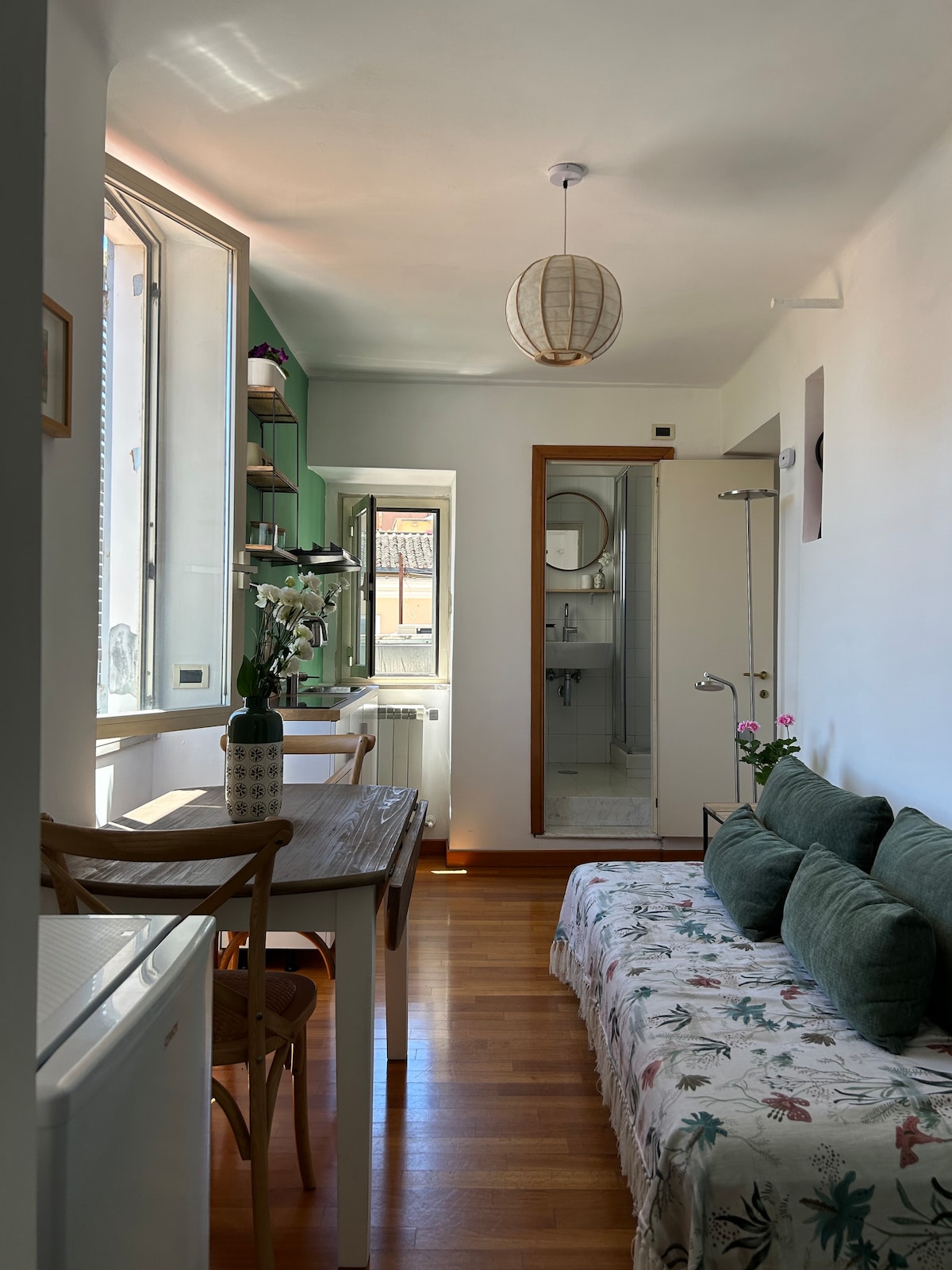 studio loft avec cuisine equippé , lave-veselle, microonde. Machine a laver. Le logement se trouve à 8 km du centre ville, près de la Via Appia Antica. Il offre tous ce qu'on a besoin pour un séjour à Rome. Très confortable le lit pour deux. Salle de bain avec douche, WC, bidet, lavabo, seche cheveux. wi-fi gratuite. chauffage / climatisation, centrale de production d'énergie solaire. Dans le quartier autour de la maison il y a de petites restaurants, bistros á deux pas.