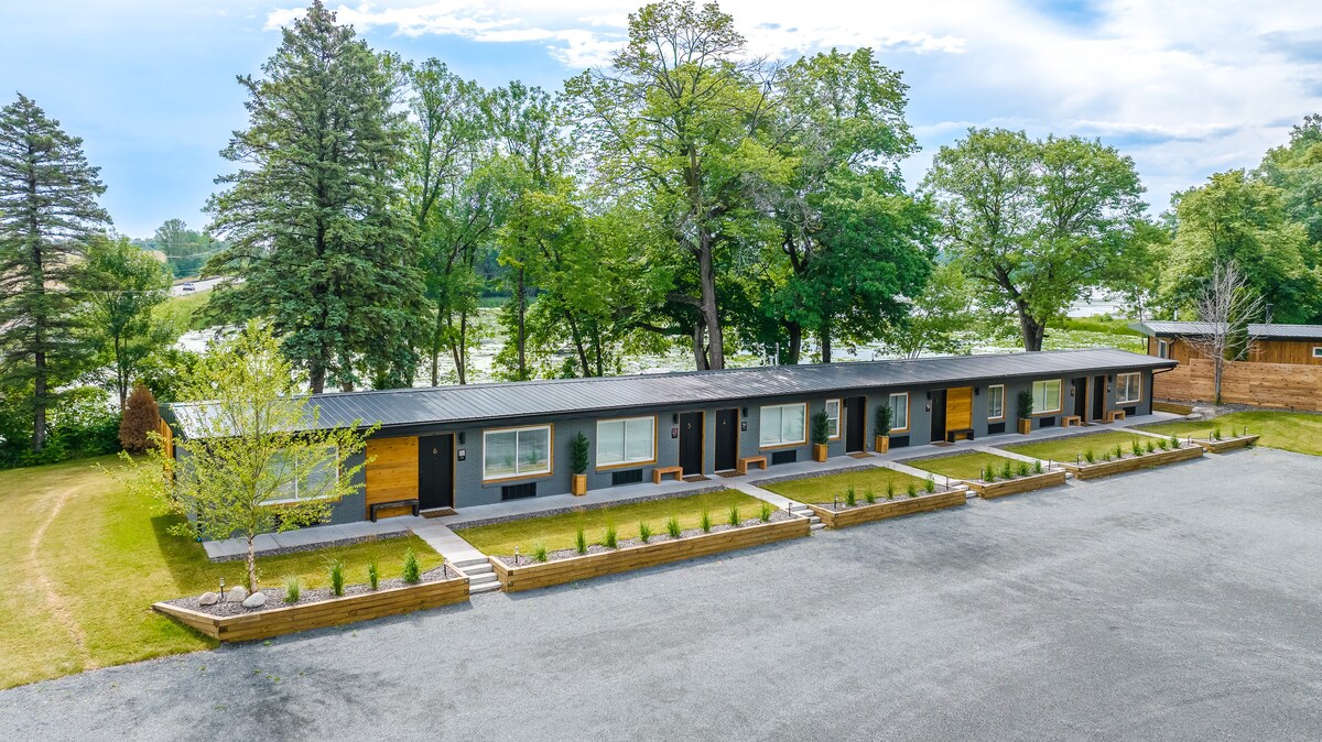 Boutique scandinave, 6 chambres, motel au bord du lac. Marché sur place, magasin d'alcool, bar sur le toit et location de bateaux. Pas de réception Pas besoin d'attendre Pas besoin d'ascenseur, entrez directement dans votre chambre privée au bord du lac, avec parking devant la porte. Patio et brasero privés Salle de bain de luxe Matelas DreamCloud Nespresso Cafetière à piston Bouilloire Grille-pain, plaque de cuisson électrique Table pour 2 personnes 4 restaurants à côté Commerces locaux de petite ville Aventure sans limites