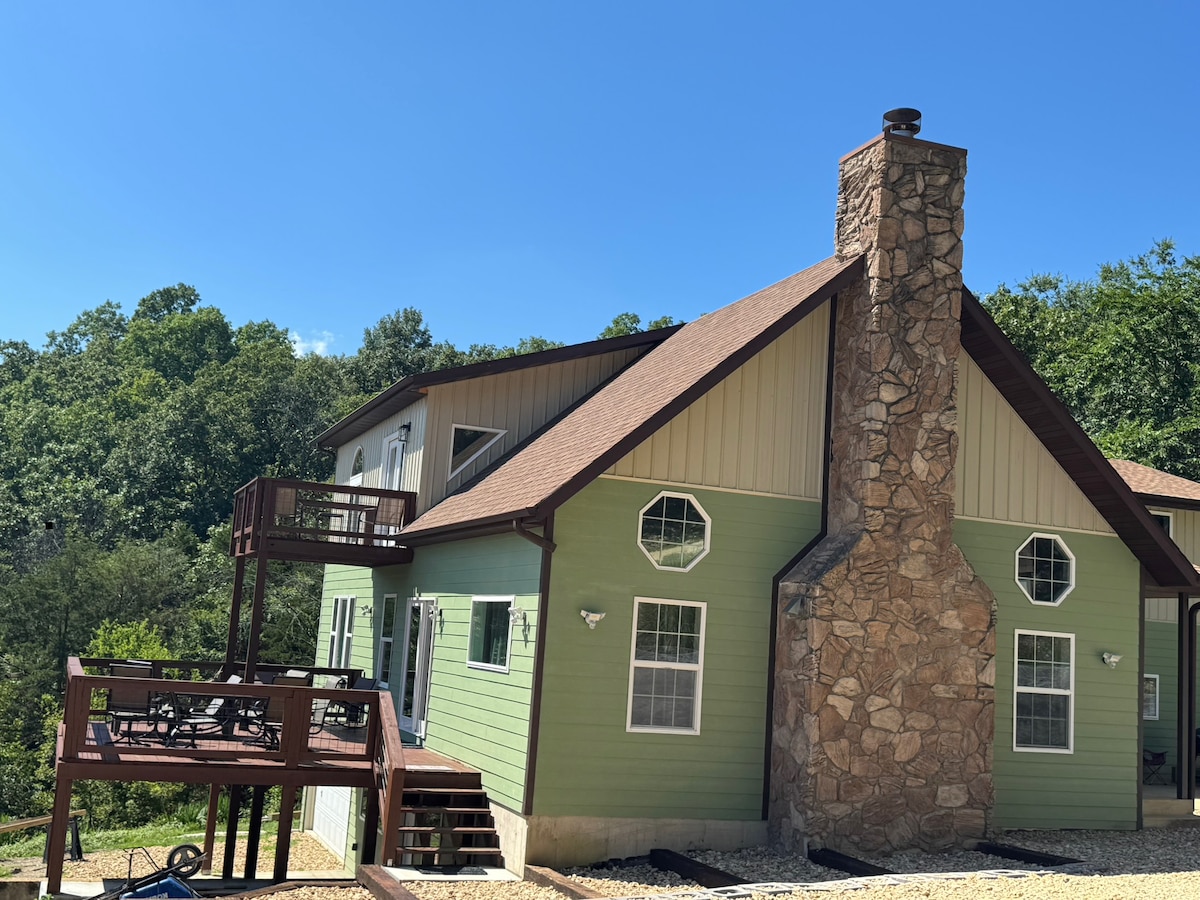 C'est une maison unique de 2 étages dans les Ozarks. Située le long d'une route de comté sinueuse et pittoresque. Construite par un homme dédié à glorifier Dieu à travers son travail. La propriété dispose de belles parois rocheuses, d'un aménagement paysage en béton et d'un escalier en bois personnalisé. Parfait pour une escapade au calme. Détendez-vous sur le patio près du foyer et faites-vous un s'more. Profitez d'un film tout en grignotant du pop-corn. Les enfants disposent d'une grande aire de jeux avec balançoires, bac à sable, trampoline et toboggan. Situé à 5 miles de Pine Meadows Venue.