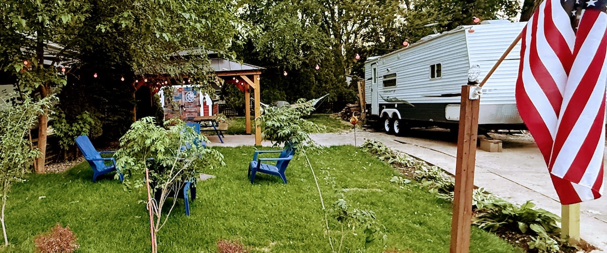 Spa ouvert toute l'année! La piscine rouvrira le 1er mai. Caravane entièrement équipée pour 5 personnes, avec salle de bain avec douche, cuisinière, micro-ondes, télévision, chauffage et climatisation, et eau courante toute l'année. Situé sur la piste cyclable et à seulement quelques minutes des plages de sable d'Indiana Dunes sur le lac Michigan. Faites une randonnée dans le parc national des Indiana Dunes le long de la rivière Little Calumet et de la ferme historique de Bailley, à seulement 1 pâté de maisons du VR. Profitez de notre grande piscine, de notre spa, de notre barbecue, de notre feu de camp et de notre aire de jeux. Planifiez votre visite dès aujourd'hui!