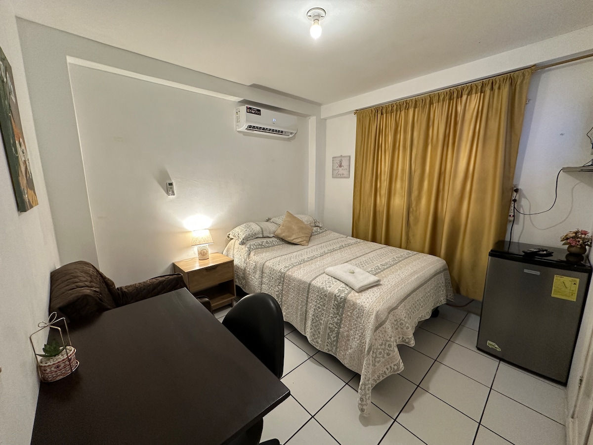 Alojamiento en zona residencial a pocos metros del Parque La Rotonda y Tennis Club. Supermercados cerca.Control de acceso digital con tarjeta de acceso. 43m2. Patio disponible. Dos aires acondicionados. Disponible sofá grande y sofá pequeño. Zona de trabajo con Internet cableado y wi-fi, escritorio grande, pizarra y mesa de reuniones. Servicio de impresión gratuito de 12:00 a 15:00. El área de cocina no tiene cocina con estufas. Dispone cafetera hervidor, freidora de aire, refrigeradora.