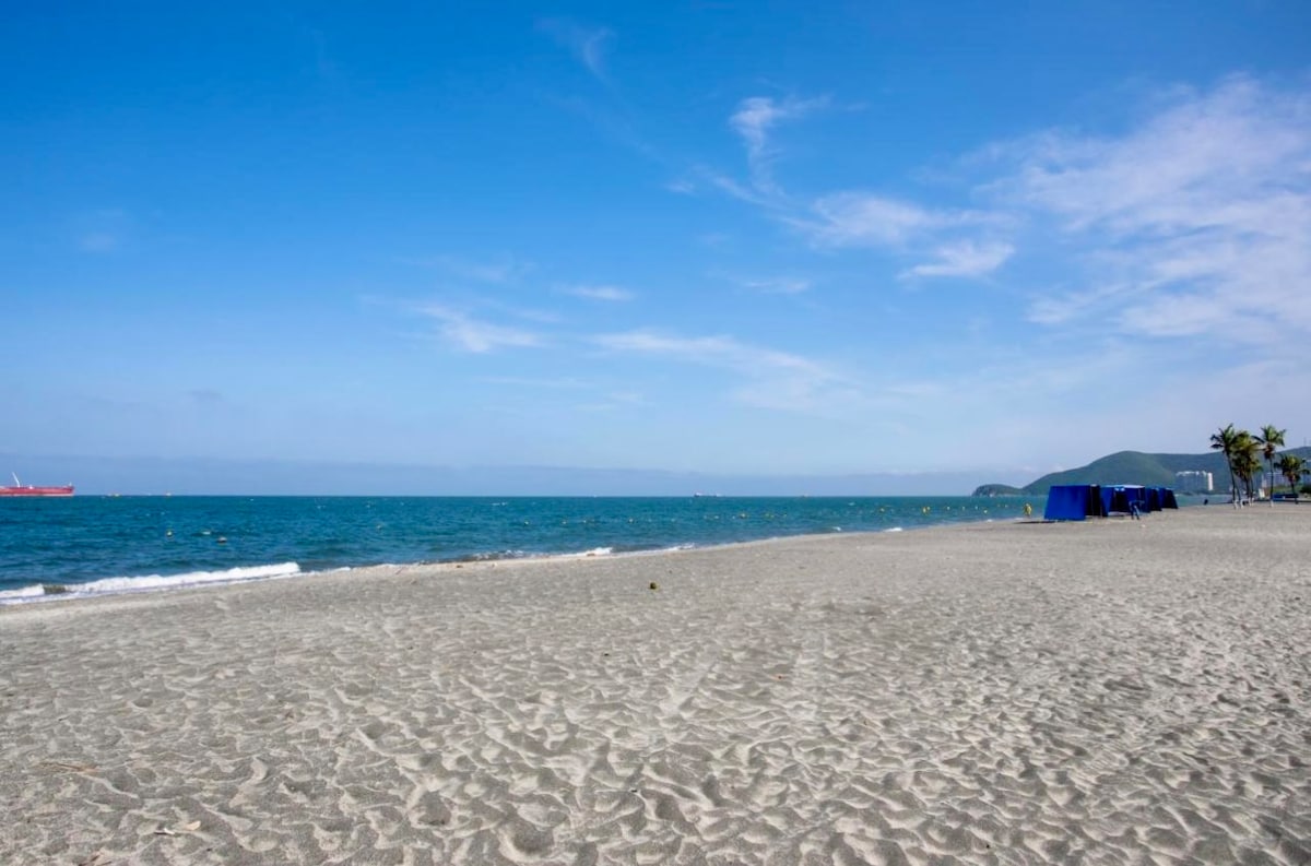 Welcome to your dream retreat in Santa Marta! Just one block from the beach and across from the Hilton, this stunning studio is perfect for couples or small families, It accommodates up to four guests. Enjoy a cozy Queen bed, a double bed, and two full bathrooms. The fully equipped kitchen is ideal for preparing meals, while a 50" TV and 500 MB internet keep you entertained. With a folding table, two air conditioners, and remote-controlled blackout curtains. You will have the comfort you need.
