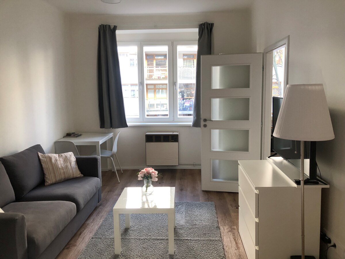 L'appartement se compose d'une chambre avec lit double, d'un coin salon avec un plancher intégré, qui dispose d'un lit double. Le salon dispose d'un canapé, d'une table basse, d'une armoire, d'une télévision + WIFI et d'armoires. L'appartement dispose d'une salle de bains avec toilettes, d'une cuisine avec cuisinière électrique et four, micro-ondes, grille-pain, cafetière, bouilloire, réfrigérateur, lave-linge, cuisine, table à manger pour 6 personnes. L'appartement est au centre du jardin Kinsky et à 1,7 km du pont Charles et de la place de la Petite Ville. Le métro est à 500 m.