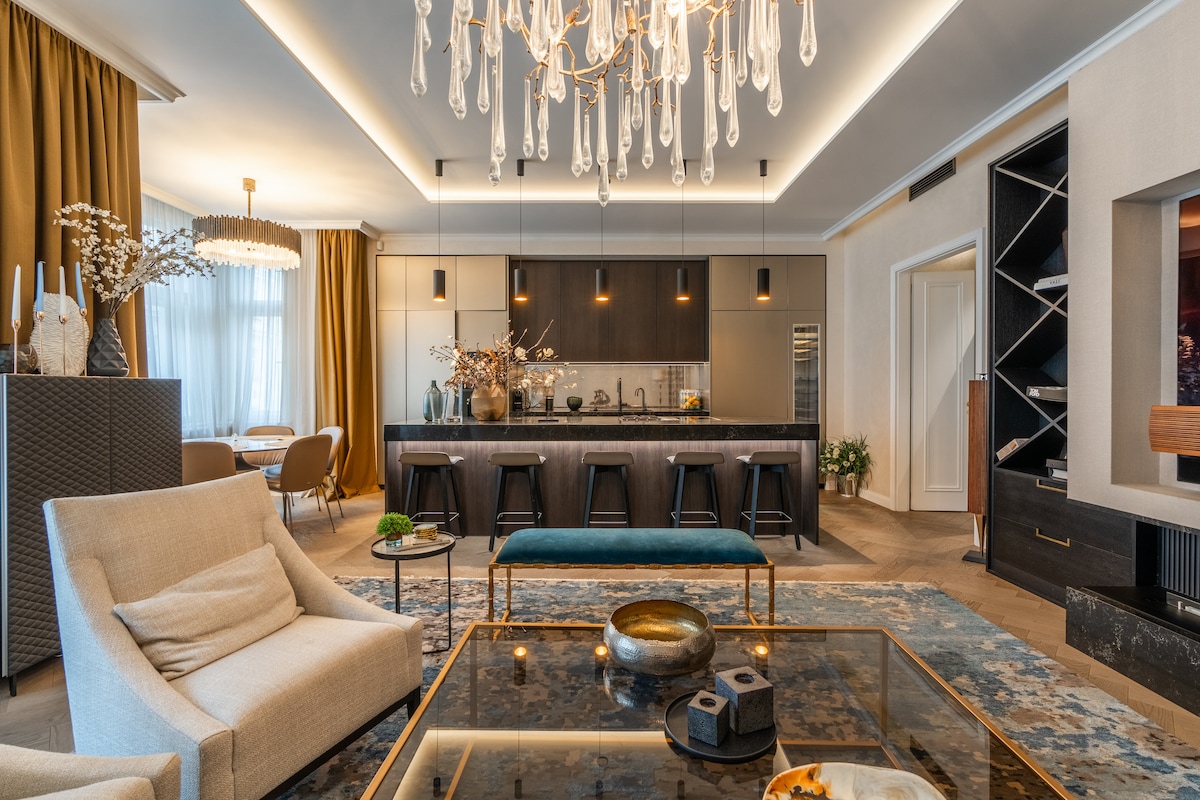 Détendez-vous avec un livre sur la chaise longue décorative, avec la lumière du soleil qui traverse les vastes fenêtres de ce bâtiment central du XVe siècle. Enfoncez-vous dans le canapé d'angle confortable et imprégnez-vous du mélange de meubles d'époque ornés et de tissus luxueux et neutres. L'appartement se trouve entre les deux places principales : la place de la Vieille-Ville et la place Venceslas, avec une vue d'angle sur le Théâtre des États. Il est également proche de la station de métro centrale principale, Mustek.