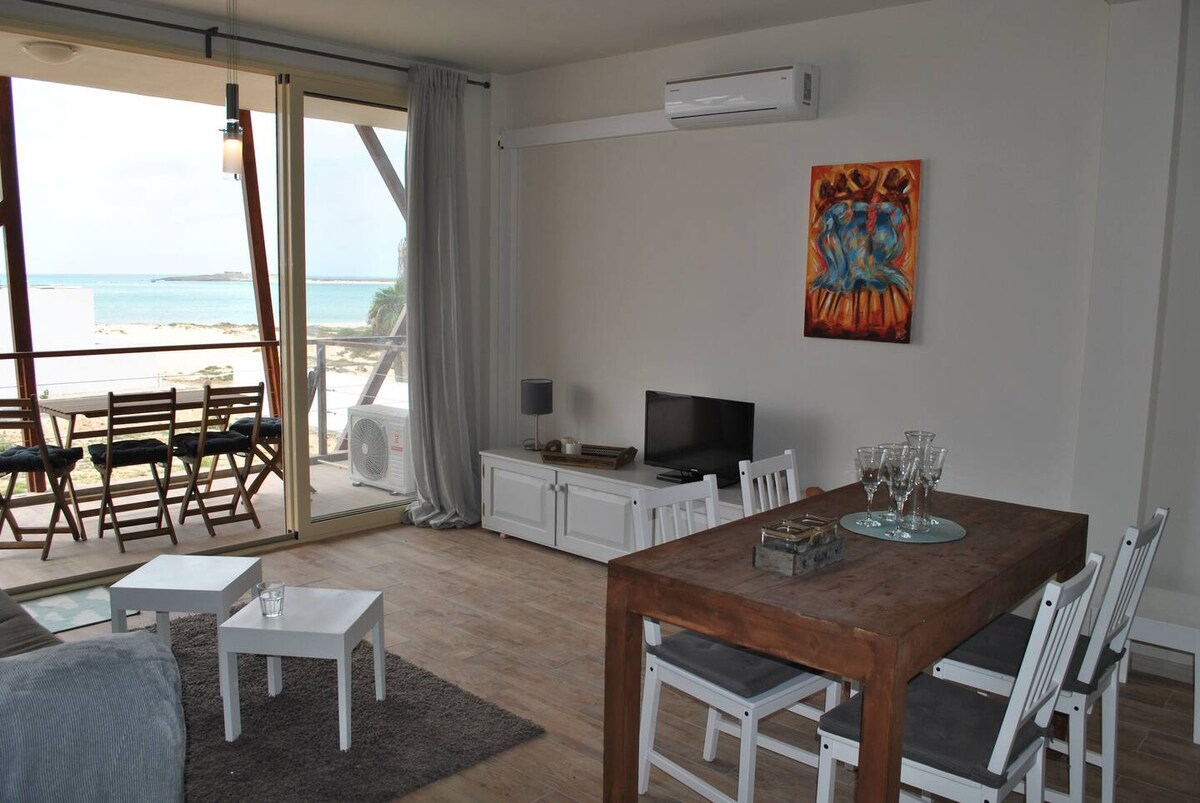 Superbe appartement AU premier étage avec une grande véranda en bord de mer et une vue imprenable sur la baie de Sal Rei. L'appartement est très spacieux avec une surface de 40 m ² convenablement divisée en espaces de couchage, de salon et de salle à manger, tous reliés entre eux par un concept de décoration intérieur moderne, minimaliste mais confortable.