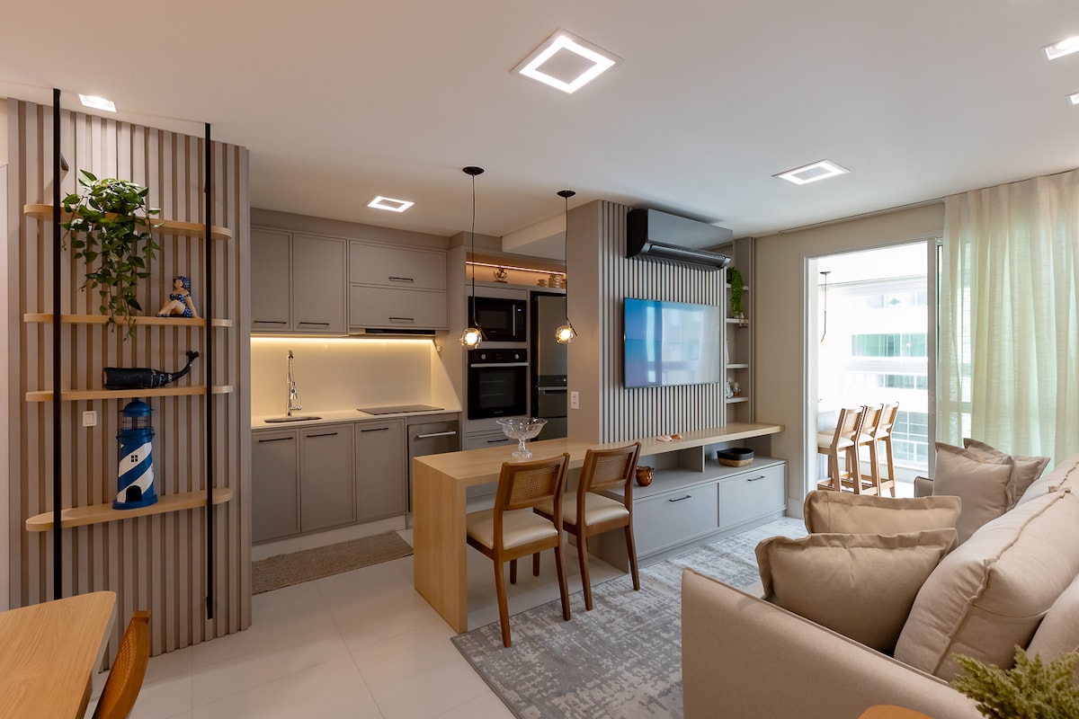 Bel appartement meublé avec goût, entièrement climatisé. Il dispose de 75m² avec un balcon fermé et une vue latérale sur la mer. Suite avec lit queen size plus une chambre avec lit double, toutes deux avec Smart TV. Cuisine, salon et balcon avec barbecue intégrés dans un concept ouvert. La cuisine est équipée de meubles planifiés, cuisinière, four électrique, réfrigérateur et micro-ondes, en plus des autres ustensiles. Buanderie avec lave-linge et sèche-linge à disposition.