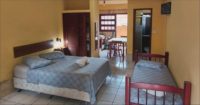 POUSO DO GUARANI | Suite avec entrée privée située dans un quartier résidentiel, style auberge, avec salle de bain privée et excellent emplacement : 200m de la mer et 800m du centre des Anglais. Intimité, confort et commodité : Wifi 240MB, TV, climatisation split, lit box, minibar, sèche-cheveux, fer à repasser, bouilloire électrique, micro-ondes. La suite est située au rez-de-chaussée et comme elle est entièrement en bois, le bruit des pas de la suite à l'étage peut être entendu. Il n'y a pas de garage.