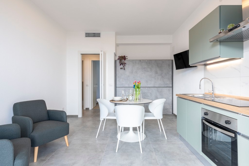 Appartement lumineux avec grande terrasse et vue magnifique sur le lac, composé de : - cuisine/salon équipée avec évier, four électrique, réfrigérateur et congélateur, micro-ondes, bouilloire, ustensiles, vaisselle, TV-SAT, Wi-Fi et canapé-lit. Sur la terrasse, il y a une table, des chaises et des transats - chambre avec lit double, grande armoire, tables de chevet et fenêtre avec vue sur le Mont Baldo. - salle de bain avec lavabo, wc, bidet, douche, sèche-cheveux, fenêtre avec vue sur le Mont Baldo.