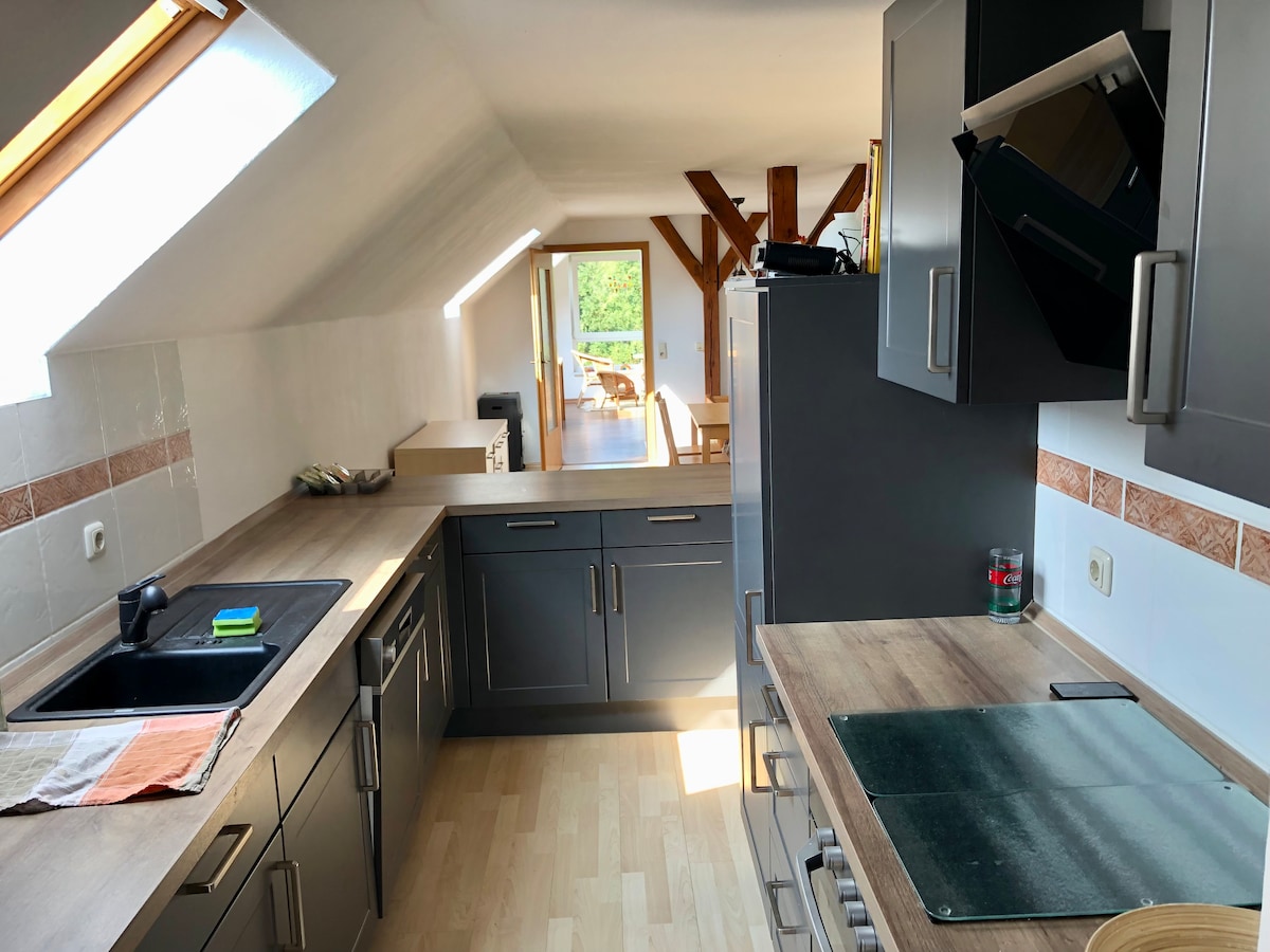 Appartement de vacances confortable (environ 75 ou 90 m²) dans une maison à colombages classée. Cuisine spacieuse et entièrement équipée avec poêle en faïence, salon avec canapé-lit, coin lecture et poêle en faïence, 1 chambre (1-2 personnes) ou 2 chambres (à partir de 3 personnes), chacune avec lit double, salle de bain avec douche et sauna. Wi-Fi dans tout l'appartement avec accès Internet gratuit. Chauffage central dans toutes les chambres. Jardin privé. Disponible moyennant un supplément : Transfert gare, service d'achat, vélos de location, canoës, gym