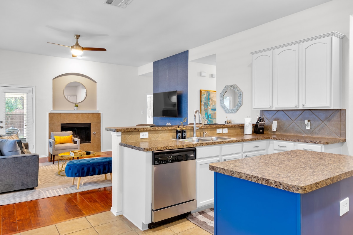 Belle maison avec tout le nécessaire pour se sentir comme chez soi. Cuisine entièrement équipée avec tous les éléments essentiels pour préparer les repas. La cuisine donne sur le séjour qui dispose d'une télévision de 70 pouces. Après vous être prélassé dans la baignoire du jardin, détendez-vous dans le matelas Tempur king size de la chambre principale. La chambre d'amis dispose d'un lit Queen Size confortable. Le patio est prêt pour les grillades. À quelques minutes du NOUVEAU Grandscape, The Star à Frisco, Legacy West, du siège de Toyota et d'innombrables autres restaurants et divertissements.
