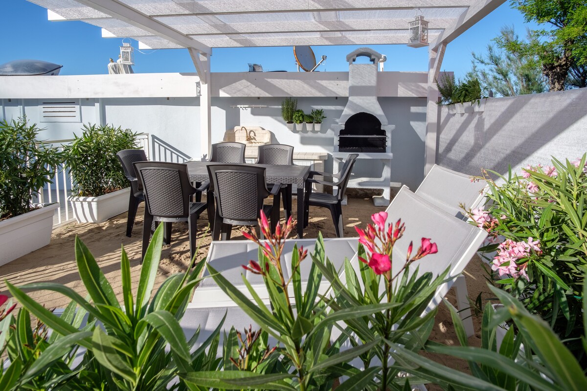 L'appartamento è all'ultimo piano di un condominio a 100 metri dal mare, e ogni stanza da sulla terrazza che è vista mare, con ampia tettoia, in modo che dopo il primo mattino l’appartamento è già in ombra e quindi è particolarmente fresco e ventilato. Nella terrazza ci si può anche mangiare. Vi è un pianoforte verticale Bechstein, accordato e revisionato, per musicisti che vogliono mantenersi in allenamento anche in vacanza.