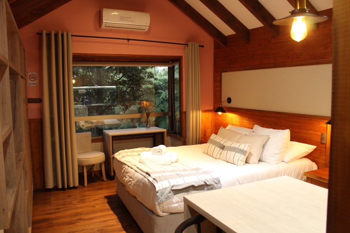 Vivez un séjour inoubliable dans notre lodge entouré de forêt indigène. À seulement 5 km de Pucón, avec un accès universel, une salle de bain adaptée et un spa privé. On pense à chaque détail : des draps de qualité supérieure, des serviettes de 700 g, des parfums subtils et des espaces conçus pour le repos. Comprend une cuisine entièrement équipée, des commodités et le wifi. Découvrez aussi notre nouvelle maison Alpina de style moderne : airbnb.com/h/alpinaenarbollodge