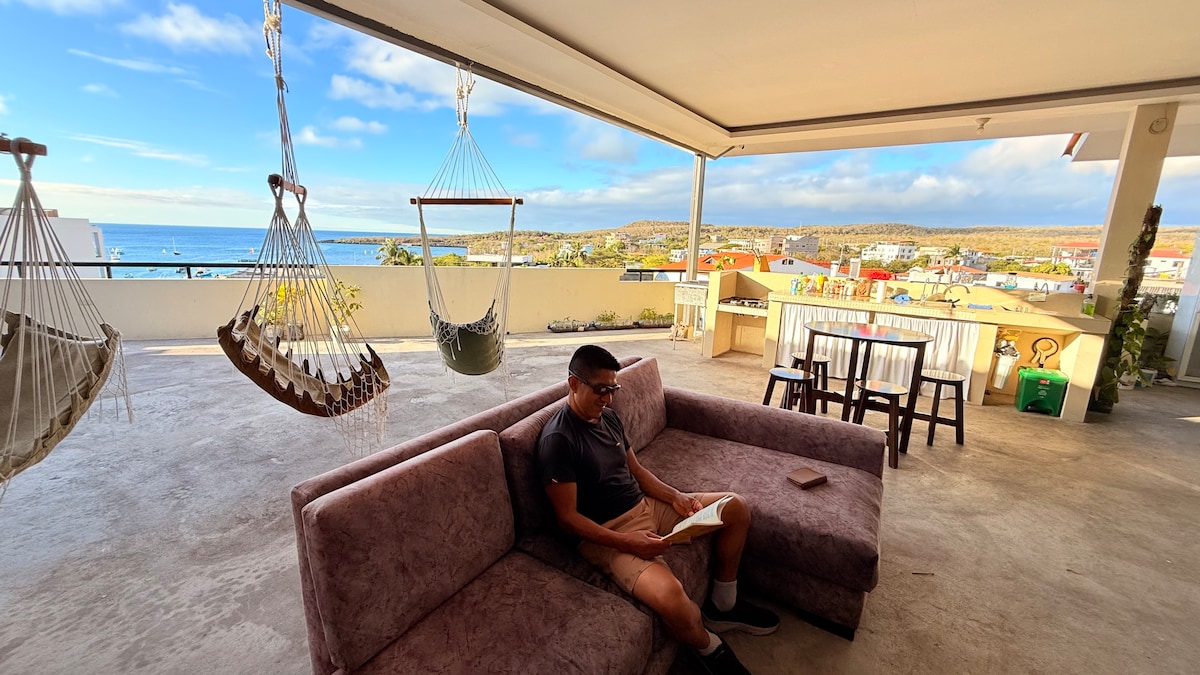 Suite Cielo, Découvrez la magie des Galapagos est située dans un endroit très privilégié, près de la plage et d'autres sites de visite. Elle offre l'une des plus belles vues de l'île. Elle est spacieuse, confortable et dispose d'une connexion Wi-Fi Starlink. La suite climatisée est entièrement meublée pour 2 personnes et se compose de 1 chambre (vous pouvez demander 1 lit king size ou deux lits simples), une petite cuisine et salle à manger, un espace de travail, un écran de 32' avec un service de streaming, une salle de bain privée avec eau chaude et un balcon.