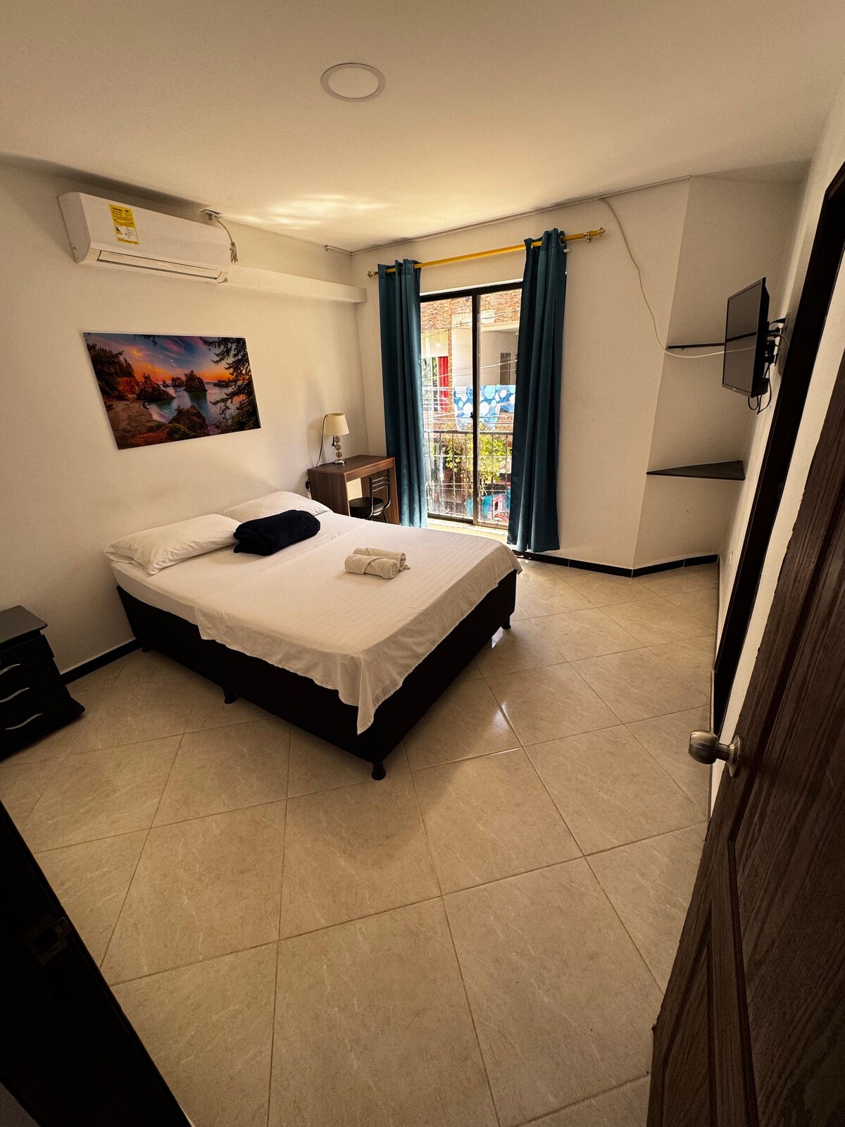 Je suis un hôtel moderne et confortable, idéal pour profiter en toute tranquillité de vos journées de vacances. Nous sommes situés à un pâté de maisons du parc principal, à 10 minutes du parc à thème Hacienda Napoles, à 10 minutes à pied de Santorin colombien et à 20 minutes de la réserve naturelle Rio Claro où vous pourrez profiter de son beau paysage et pratiquer différents sports extrêmes. Le logement comprend une piscine, celle-ci est à 3 pâtés de maisons de l'hôtel. Vous pouvez y aller à pied cela prendrait 5 min.