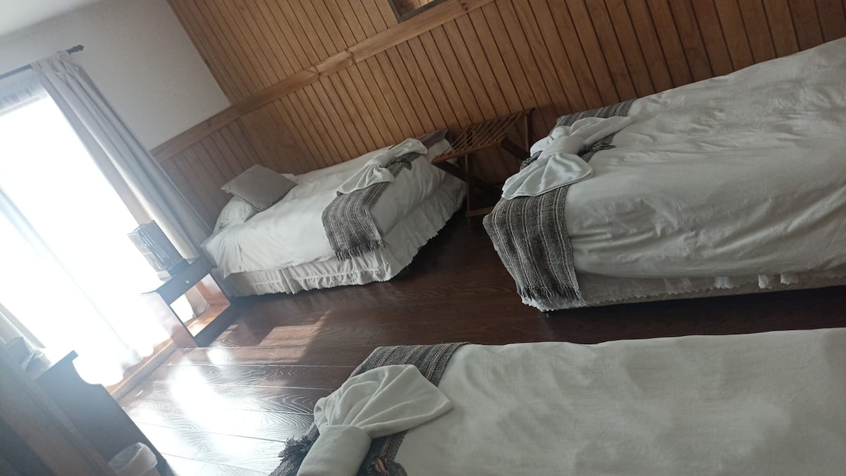 Bonjour ! À Breathe Patagonia, nous sommes très proches de la ville, nous avons apprécié le calme rural. La vue de notre hôtel est privilégiée. Ce prix comprend le petit déjeuner américain et un service de femme de ménage pour 12 personnes dans 6 chambres doubles avec salle de bain privée, couvrant un étage de l'hôtel. Nous avons une capacité totale de 16 passagers et avons des espaces pour travailler à distance. Demandez des chambres disponibles pas de soucis nous vous attendons !