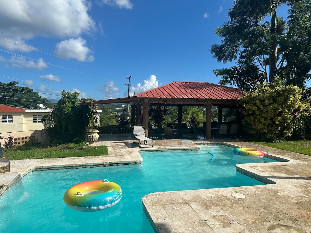 Dans une haute montagne dans le village de Barranquitas avec de belles vues et une intimité unique. Il dispose de 3 chambres, 2 intérieures avec climatisation et 1 à l'extérieur dans une petite cabane extérieure avec ventilateur, pour une expérience de camping inoubliable, en plus d'une piscine chauffée, en plus d'un service de restauration livré à la propriété au cas où vous ne voudriez pas sortir. Nous sommes à 1 heure de San Juan, à 25 minutes de Toro Verde, à 15 minutes du canyon de San Cristobal…