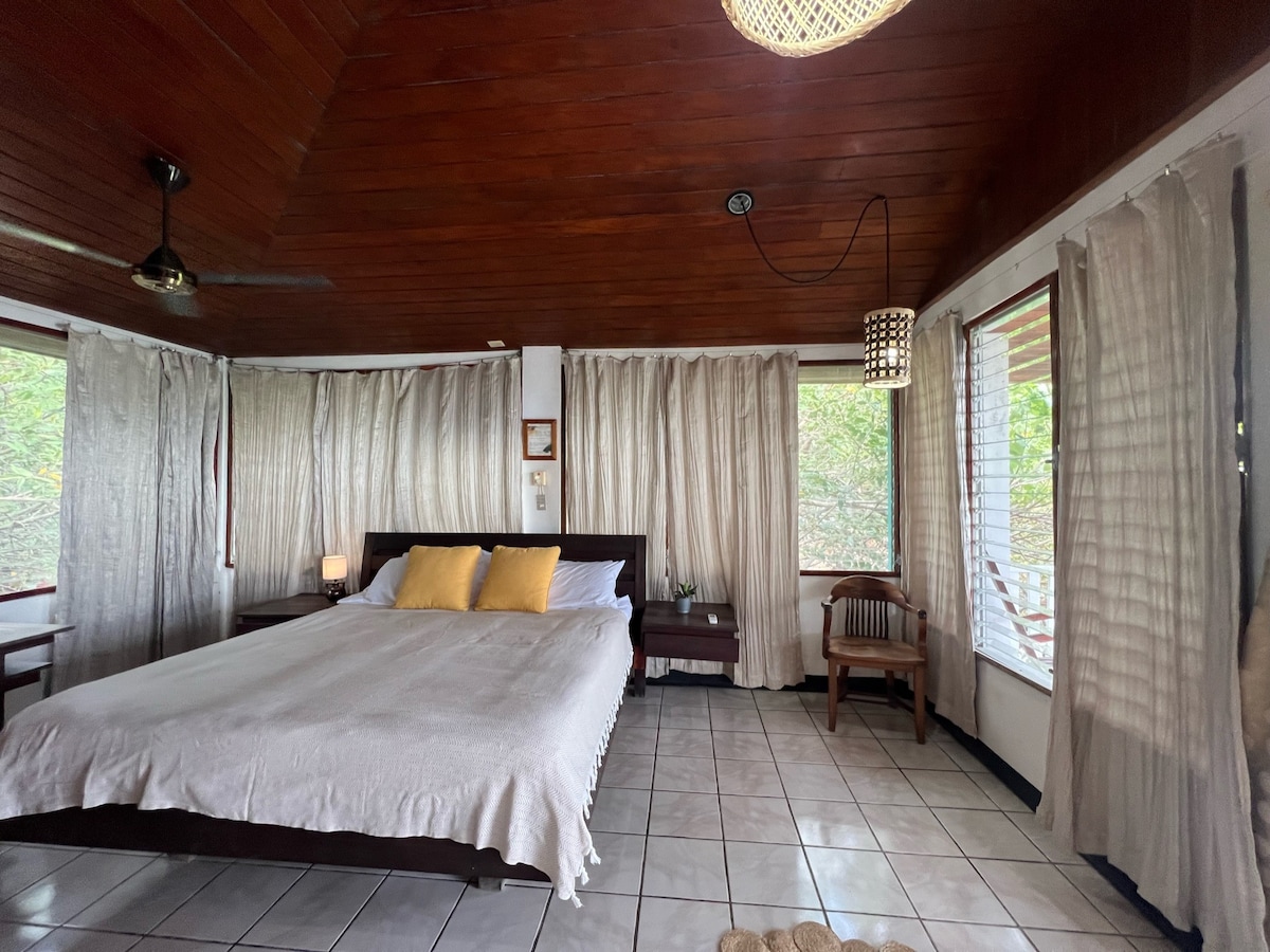 Hand-made Bungalow with an amazing sea view. The Chalet includes 1 king size bed, a living room with twin beds, bathroom and kitchen area with a coffee maker and coffee. You can ask for a home made local breakfast (extra cost) The Chalet is located on a hill, meaning you will you need to walk 50m up to access the house. Your car will stay at the parking lot down the hill. We are located - 400m from playa Manzanillo - 3km from playa Rajada/El Jobo/Copal - 19km from La Cruz
