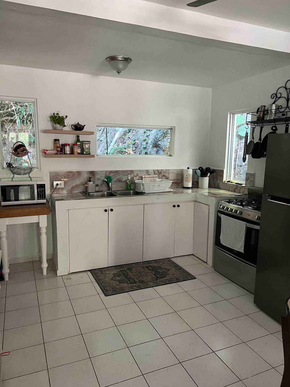 Logement de 3 chambres et 2 salles de bain avec ventilateurs de plafond dans chaque pièce (pas de climatisation). Cuisine en plein air, barbecue Weber, WiFi, haut-parleur Bluetooth, hamacs, piscine de 40 x 10 avec eau salée, salle de sport avec poids et banc, kettlebells, tapis de yoga, équipement de Pilates, cordes à sauter. Draps, serviettes de plage/bain, articles de toilette, lave-linge/sèche-linge inclus. L'allée peut accueillir 3 voitures. La construction active du quartier est prise en compte dans les prix réduits. Pas de télévision sur place. Énergie solaire et réservoirs d'eau de secours.
