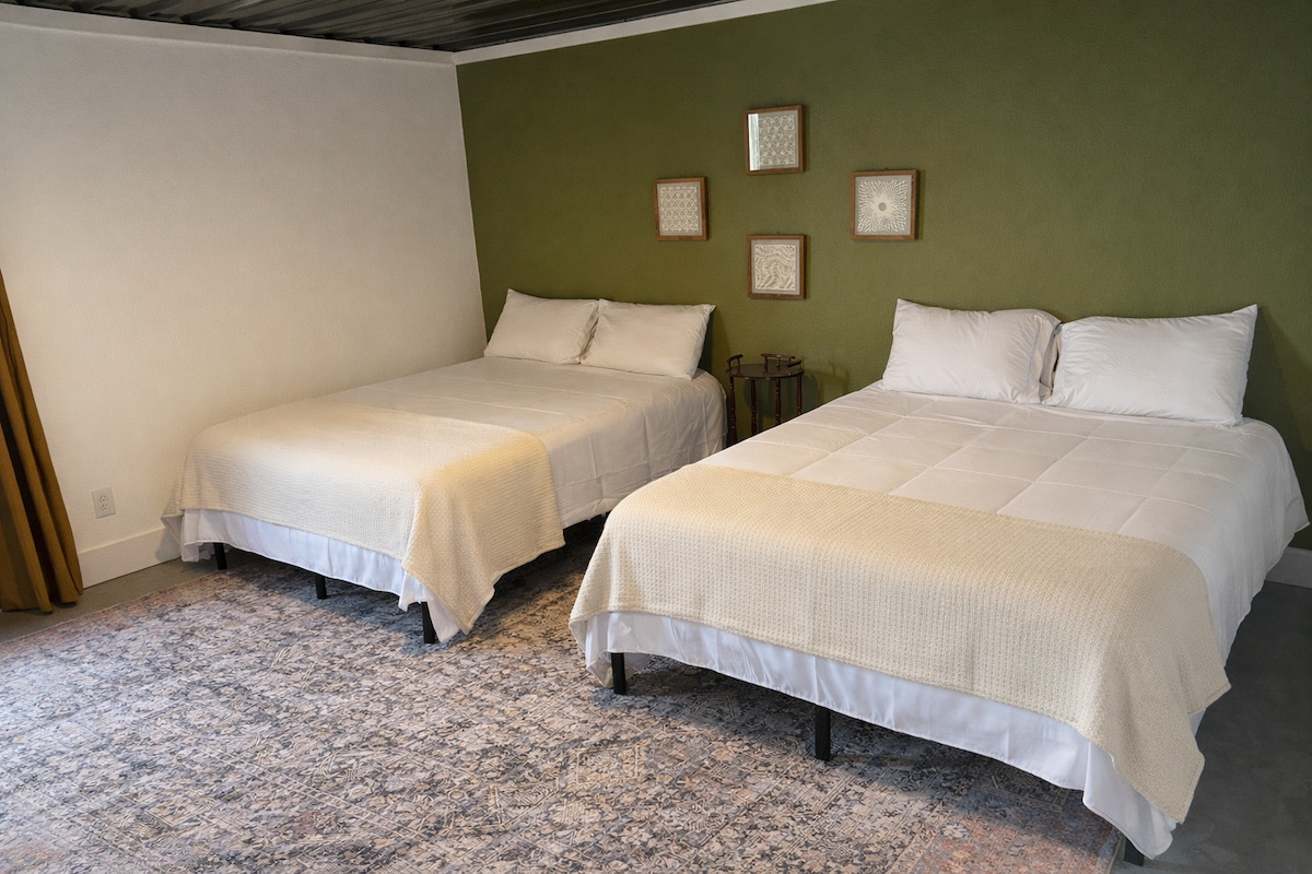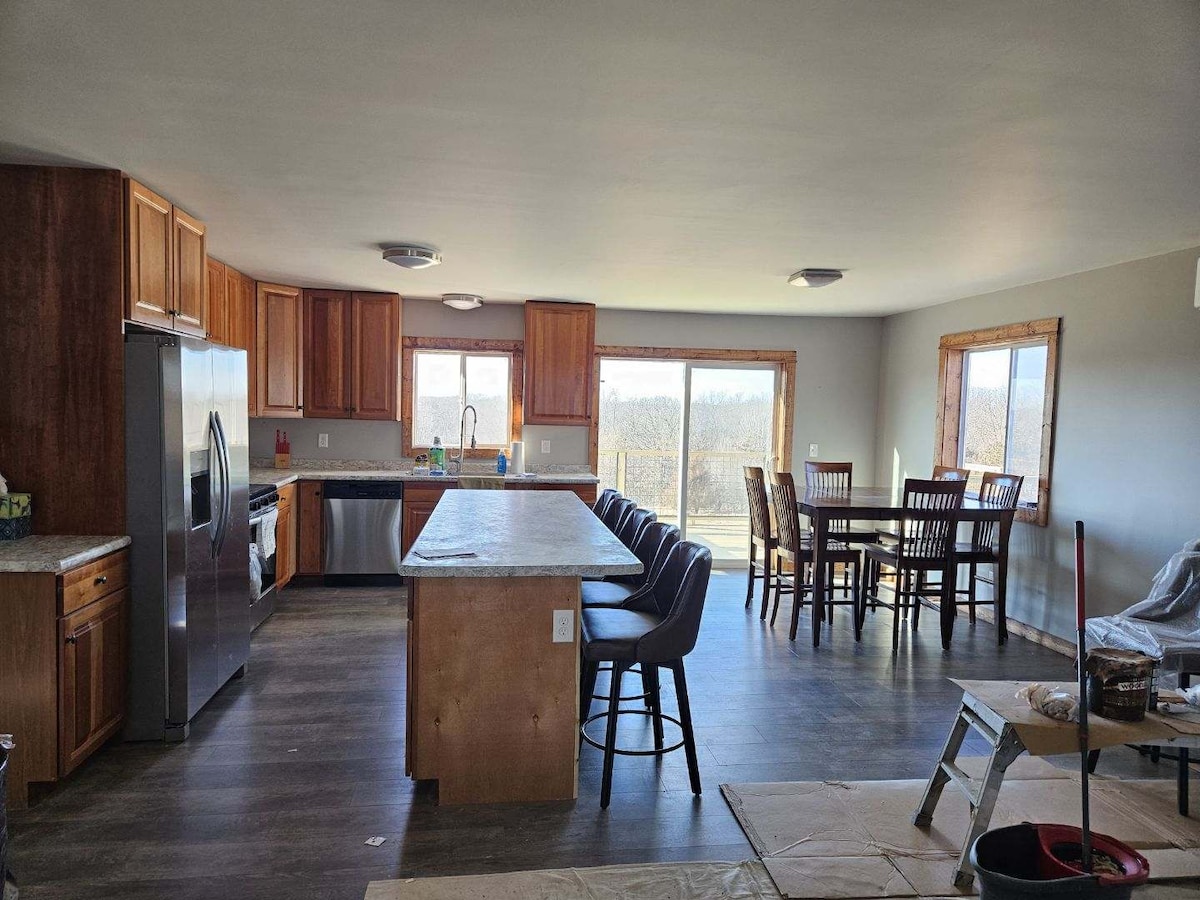 L'appartement 8 du Lawrie Farmstead Lodge offre un séjour confortable avec beaucoup d'espace pour se détendre après une longue journée à l'extérieur. Doté de deux lits queen et d'un lit jumeau, ce logement est parfait pour les chasseurs, les couples ou les voyageurs qui veulent plus d'espace pour s'étirer.