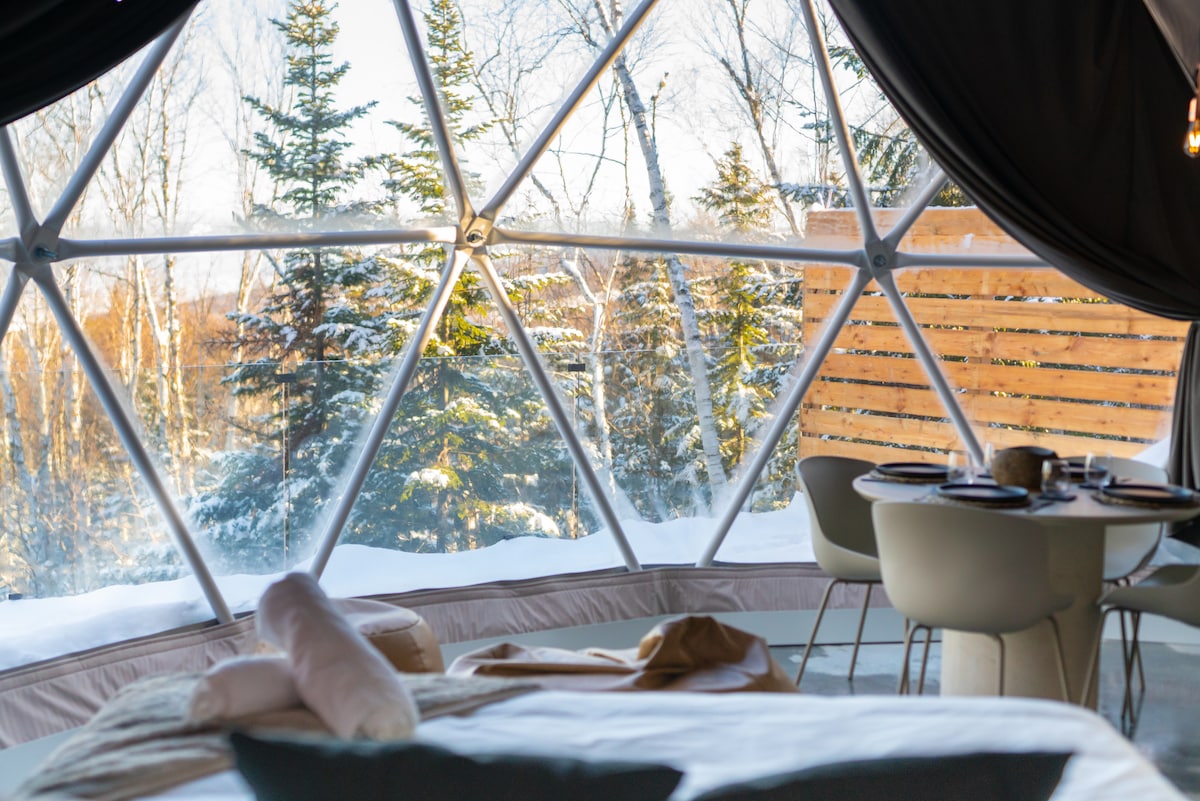 Bienvenue à Nørdika Charlevoix. Nous offrons des dômes exclusifs meublés avec tous les équipements nécessaires, en veillant à ce que votre séjour soit facile, relaxant et mémorable. Chaque dôme a sa propre terrasse et son jacuzzi. Perchés au milieu de la cime des arbres, ces dômes offrent une vue idéale sur le fleuve Saint-Laurence et les montagnes environnantes. À l'intérieur de chaque logement, nous proposons une salle de bain complète, une kitchenette , une cheminée au bois, un lit King Size, une mezzanin avec un lit double et un espace de vie confortable.