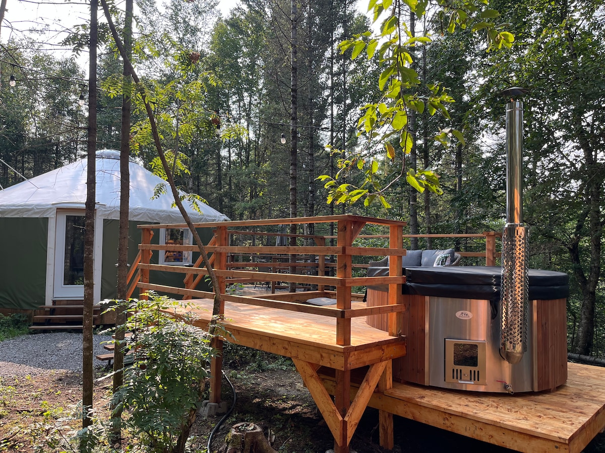 La saison estivale est ouverte du 8 mai au 31 octobre 2026 et la saison hivernale (seulement les fins de semaine de janvier à avril). On propose des séjours d'une nuit! Profitez de cette yourte confortable isolée hors réseau (alimentée à l'énergie solaire), avec un mobilier éclectique, située dans un environnement forestier privé. Sur la terrasse, un barbecue avec des ustensiles de cuisine et un ensemble de patio sont fournis en été - pas d'eau pendant la saison hivernale (novembre-30 avril) - une petite toilette chimique est fournie. Profitez de la simplicité confortable et détendez-vous dans la nature; service de sauna disponible 50 $ .