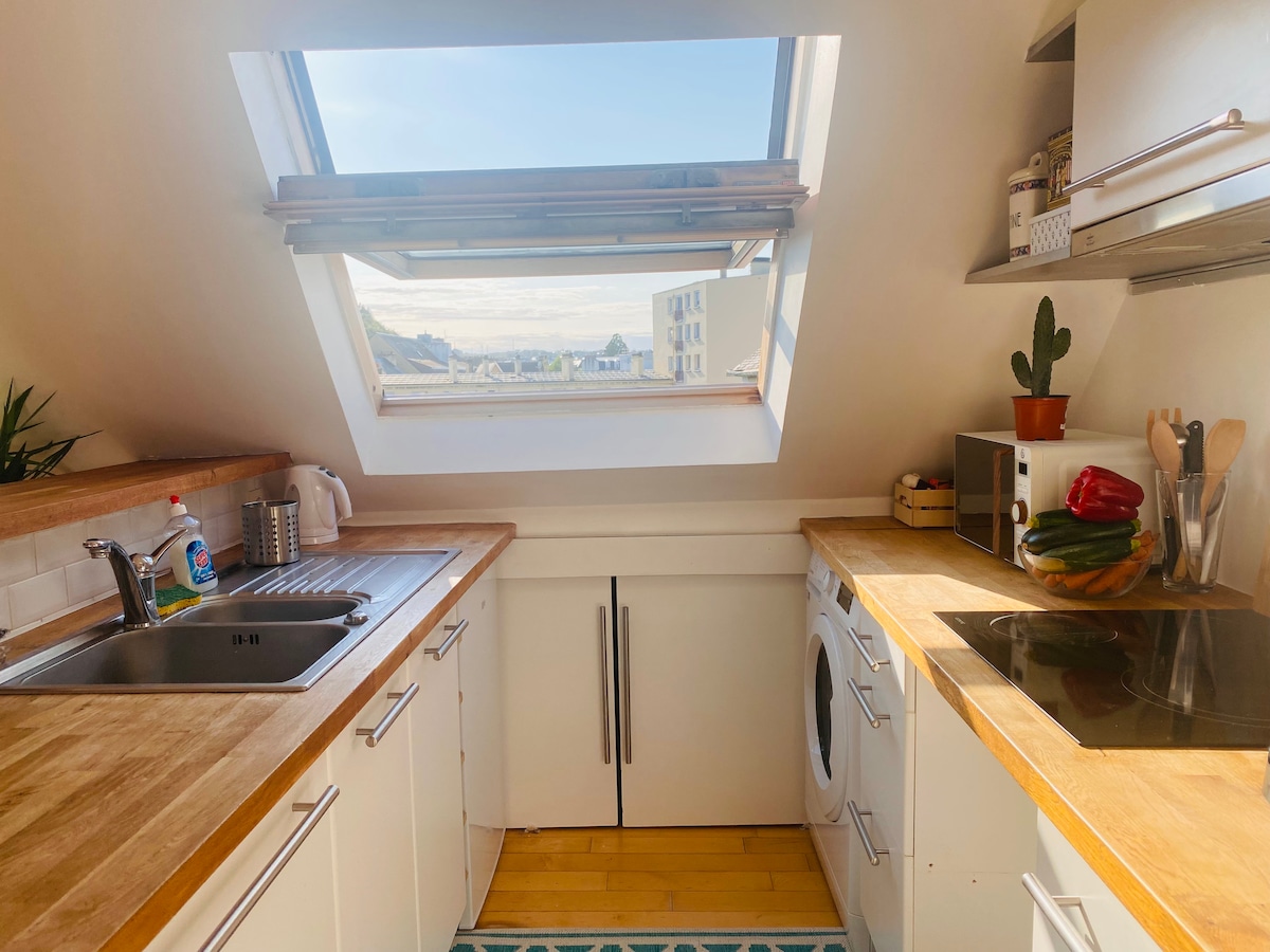 T2 entièrement équipé de 30 mètres carrés dans le centre historique de Quimper, à la lisière de la zone piétonne, à 100 mètres de la cathédrale et proche des restaurants, musées, administrations, boutiques, pubs, théâtres, galeries d'arts et librairies. L'appartement est proche de la gare. Le stationnement est payant au pied de l'immeuble pendant la journée, ou en permanence gratuit à 450 mètres. Ce logement, d’excellent rapport qualité/prix, est idéal pour le télétravail ou le tourisme.