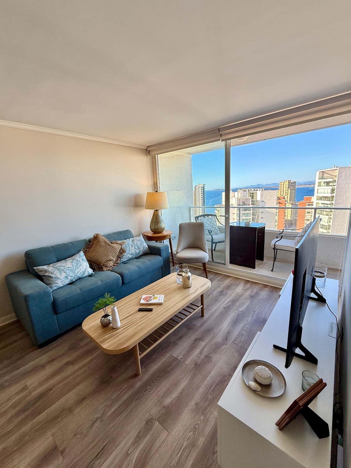 Excellent emplacement, à quelques minutes à pied des plages d'Acapulco et d'El Sol, des restaurants, des pâtisseries, des bars, du casino, du centre commercial Marina et des supermarchés. Vue imprenable sur la mer et la baie de Valparaiso. Nouvel appartement au 17e étage, entièrement équipé, Wifi, 2 Smart TV avec câble. Filet de sécurité sur toute la terrasse de 12 mètres de long. Accès à l'appartement avec badge électronique et sécurité 24 h/24 et 7 j/7. Parking souterrain. Animaux acceptés (petits animaux de compagnie)