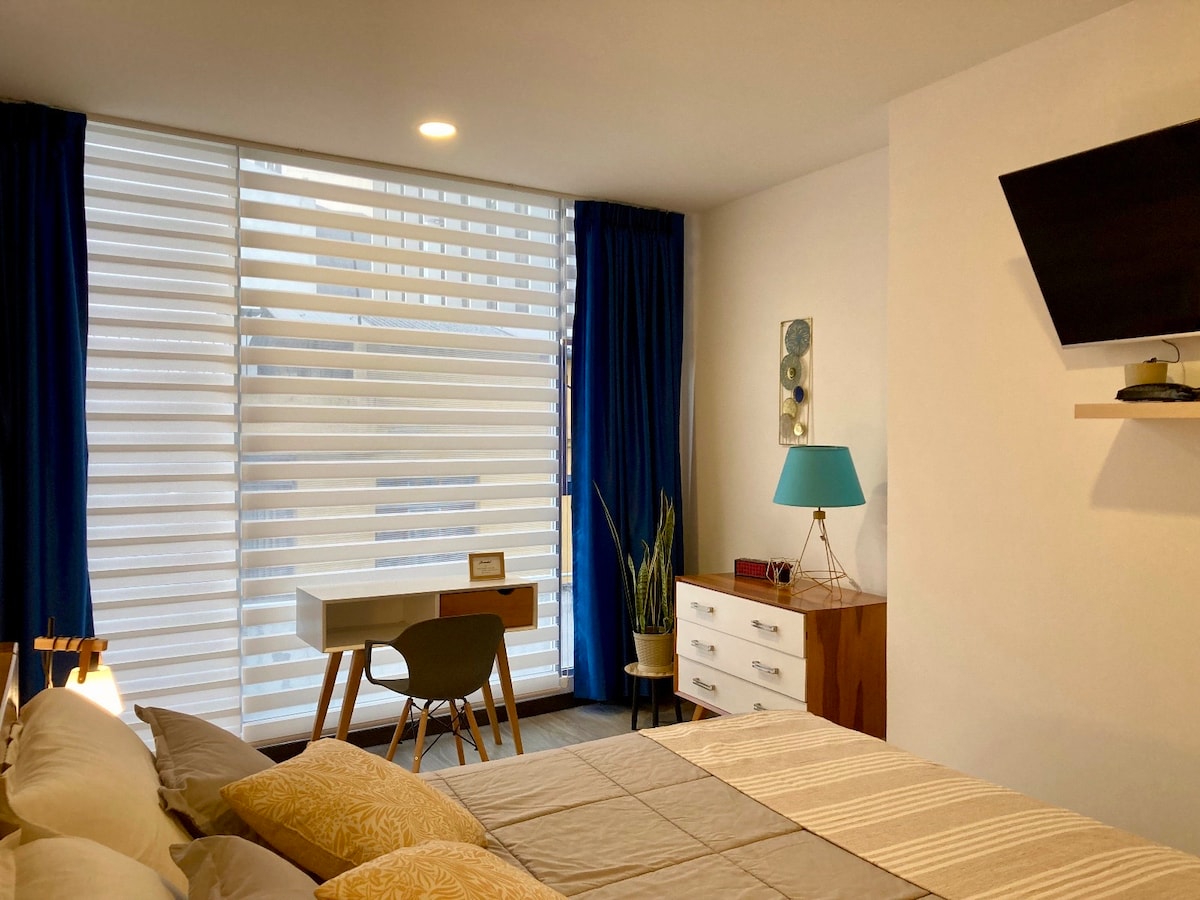 Mini suite moderne totalement indépendante, avec une vue panoramique fantastique sur Quito. Située dans le meilleur secteur de la ville, La Carolina, le cœur du Quito moderne. Le bâtiment comprend une piscine, un jacuzzi, un sauna, un bain turc, une salle de sport, un espace de coworking et un service de blanchisserie. Nous avons Netflix et le WiFi haut débit.
