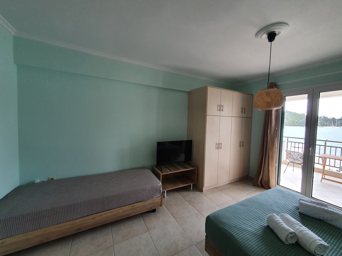 Cet endroit spécial est au centre de Nydri, la plus grande station estivale de Lefkada, ce qui en fait le point de départ idéal pour explorer l'île. Ces appartements entièrement équipés sont idéalement situés et vous offrent la commodité du centre de Nydri mais aussi le calme et la tranquillité avec une vue incroyable ! Le balcon spacieux est idéal pour se détendre tout en profitant de la vue. Prenez un livre ou votre boisson préférée et profitez de la légère brise et du ciel nocturne.