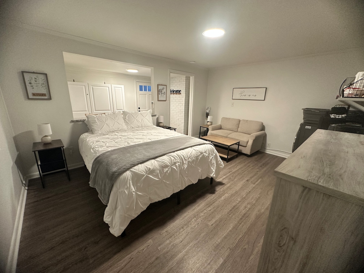 Bienvenue ! Notre suite Boho est spacieuse, confortable et privée avec Internet fibre gigabit. Entrée privée également ! Dans le salon, vous pouvez regarder Netflix à la télévision ou travailler au bureau. Puis, quand il est temps de dormir, vous pouvez vous déplacer dans la chambre, fermer la porte de la grange et vous blottir dans le lit. Réveillez-vous frais et dispos le matin avec notre station de café (Keurig, réfrigérateur et micro-ondes). Nous sommes situés dans un quartier sûr et calme, à quelques minutes en voiture de n'importe où dans le Triangle. Nous serions ravis de vous accueillir !