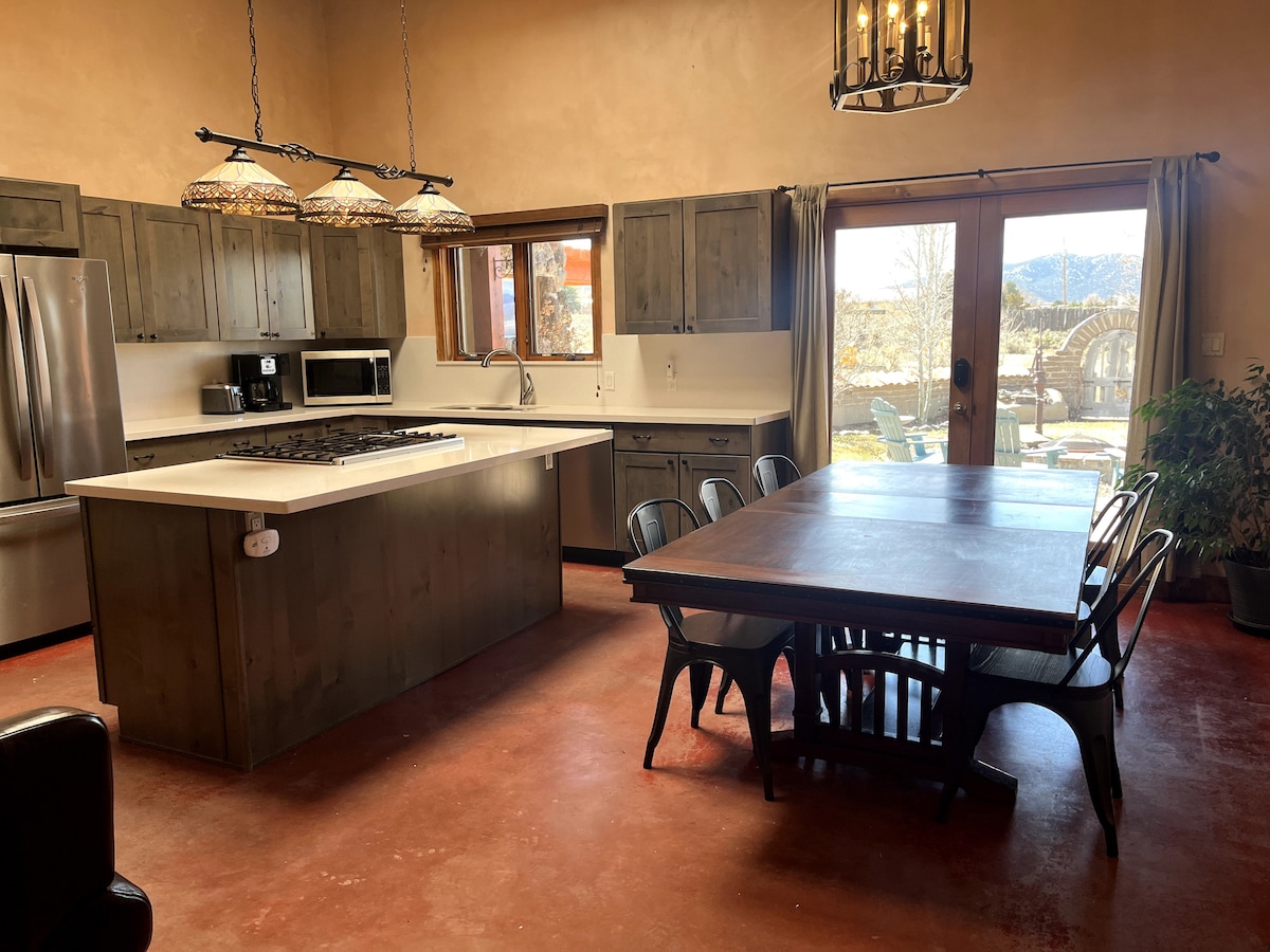 Détendez-vous dans cette retraite moderne paisible nouvellement construite à proximité de la ville. Parfait pour les petites familles ou deux couples. Profitez de la vue à presque 360 degrés, des couchers de soleil épiques, de repas en plein air et d'un tout nouveau jacuzzi. À seulement 4 miles de Taos. Vous obtenez le meilleur des deux mondes : ce sentiment d'être loin de tout tout en étant à quelques minutes d'une gastronomie et d'un art incroyables. Nous sommes également à moins de 30 miles de Taos Ski Valley et d'Angel Fire Resort. Créez vos souvenirs à Casa del Sol.