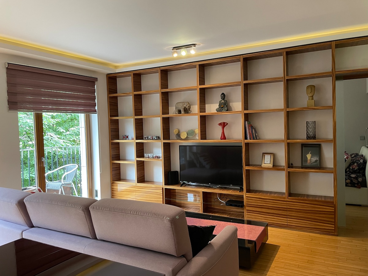 Bienvenue dans cet endroit magique ! Bel appartement très lumineux dans le centre d'Ursynow, parfait pour un séjour dans la capitale ou télétravail. Situé très proche du métro Imielin (5 min à pied) je suis adapté comme base pour les excursions vers le centre ville ou l'exploration de la région. L'appartement dispose d'environ 60 m2 et d'une terrasse verdoyante de presque la même zone (!). Décoré de modernité et de fraîcheur, ce sera l'endroit idéal pour se détendre et passer du temps :) La cuisine est entièrement équipée.