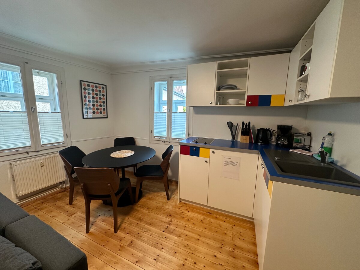 L'appartement se trouve au rez-de-chaussée et est agréablement frais en été. Il a été entièrement rénové et conçu avec amour et beaucoup d'habileté artisanale par nos soins. L'atelier de bois est dans la maison. (uniquement comme passe-temps... il ne faut pas s'attendre à du bruit)😉 Le jardin est une petite oasis et il y a mon atelier de fleuriste, que j'exploite commercialement. Les pièces de l'appartement sont lumineuses, spacieuses et conviviales. Des stores occultants sont installés. La cuisine est bien équipée avec tout le nécessaire. En tant qu'hôte, j'habite sur place et je suis toujours disponible pour répondre à vos questions. Des livres et des jeux sont disponibles.