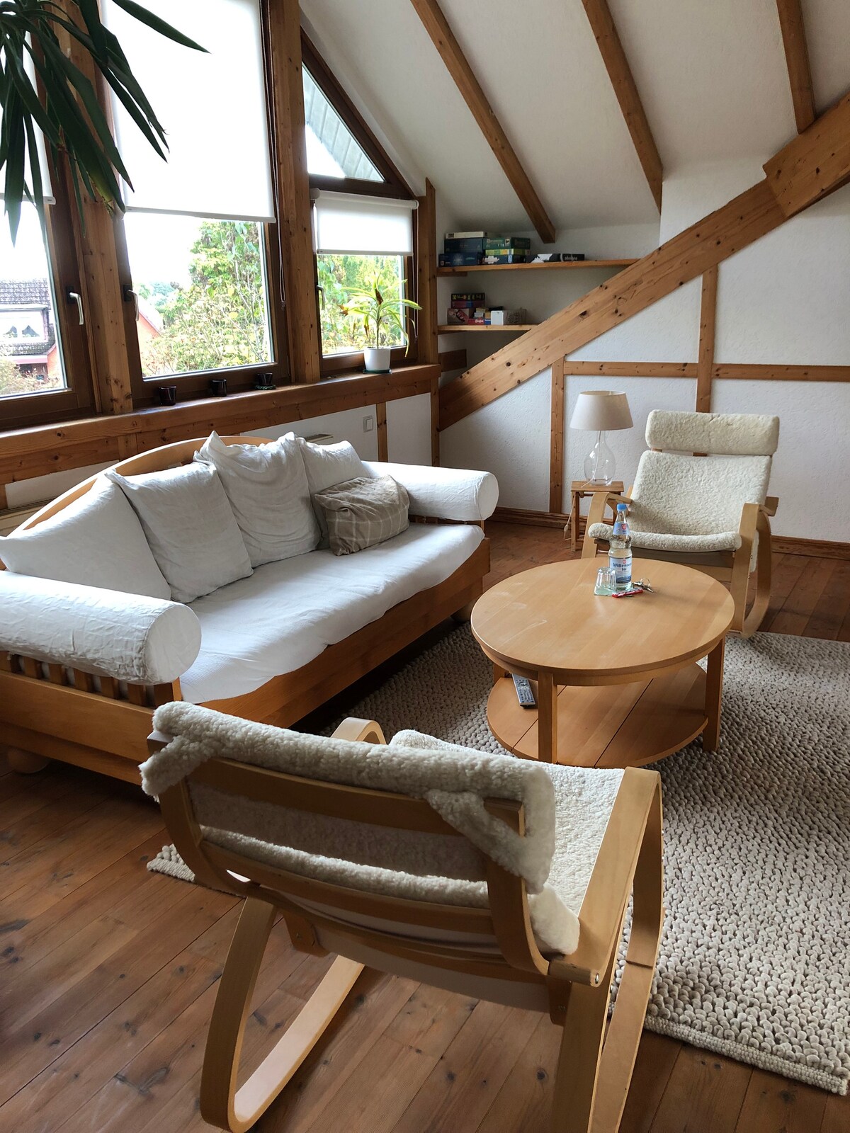 Appartement mansardé confortable, bien lumineux, 2 lits simples 1,00x 2,00 m ou assemblés comme un lit double (200x200), ainsi qu'un lit simple (100x200) dans la chambre voisine séparée (également dressing). Si d'autres invités viennent, il est possible de déplier un matelas pliant pour le sol ; petite cuisine entièrement équipée, grande baignoire et douche, télévision, téléphone et wifi Un parking privé est disponible juste devant la porte d'entrée.
