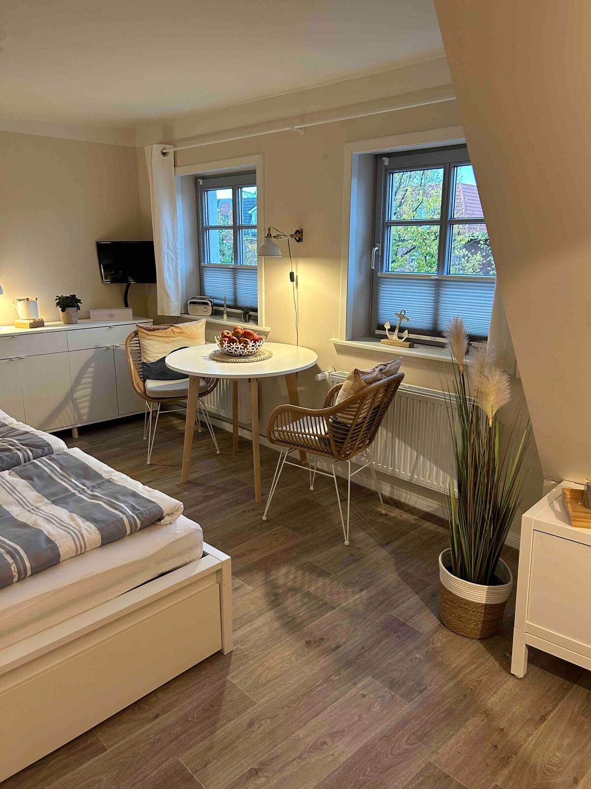 Les trois appartements sont situés dans une maison traditionnelle de Rendsburg, au centre de la vieille ville, directement sur la place du pont du bateau à l'intérieur de la zone piétonne. L'appartement Eider (DTV 3 étoiles) au 2ème étage dispose d'une chambre avec lit double, d'un salon avec kitchenette intégrée, d'un canapé avec table basse, d'une table à manger, d'un couloir, d'une salle de douche, d'un débarras – ensemble d'environ 40 m².