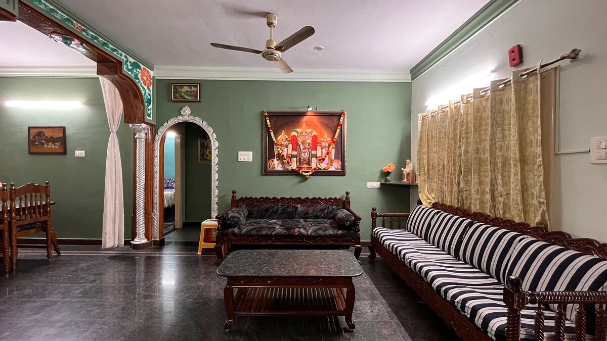 Parfait pour les familles jusqu'à 10 personnes! Et pour les pèlerins. Endroit paisible où vous profiterez de nos espaces bien conçus, d'une hospitalité chaleureuse et de tous les éléments essentiels qui vous feront vous sentir comme chez vous. Séjour pratique à Tirupati. * 2 lits simples et 2 lits doubles de haute qualité * 2 chambres à coucher, climatisation de marque haut de gamme * 2 chambres avec salle de bain attenante, eau chaude 24 heures sur 24, 7 jours sur 7 * table à manger avec chaises * grande salle télé Diwaniya lit pliant canapé et chaises * Cuisine avec ustensiles pour préparer des repas cuisinière à gaz à deux brûleurs * purificateur d'eau et réfrigérateur * stationnement pour voiture