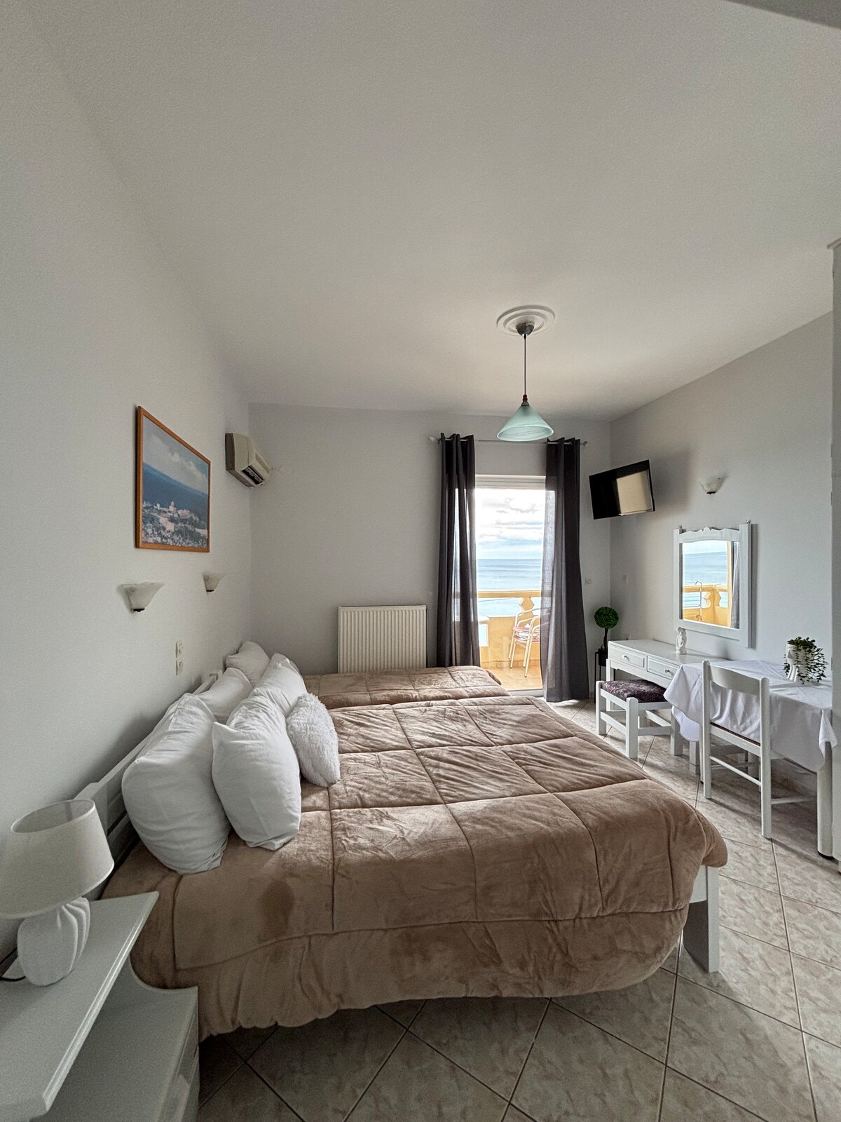 Ce studio de luxe récemment rénové avec une vue panoramique imprenable sur la mer et le coucher du soleil, est situé au sommet d'une petite colline dans un quartier calme, avec un parking gratuit dans la rue. La vieille ville est à 12 minutes à pied. Il dispose d'un espace ouvert (chambre - cuisine) et d'une salle de bain d'environ 27 m² entièrement équipée. Vous êtes autorisé à utiliser tous les espaces de l'hôtel de luxe adjacent MACARIS SUITES & SPA en commandant un repas ou une boisson.